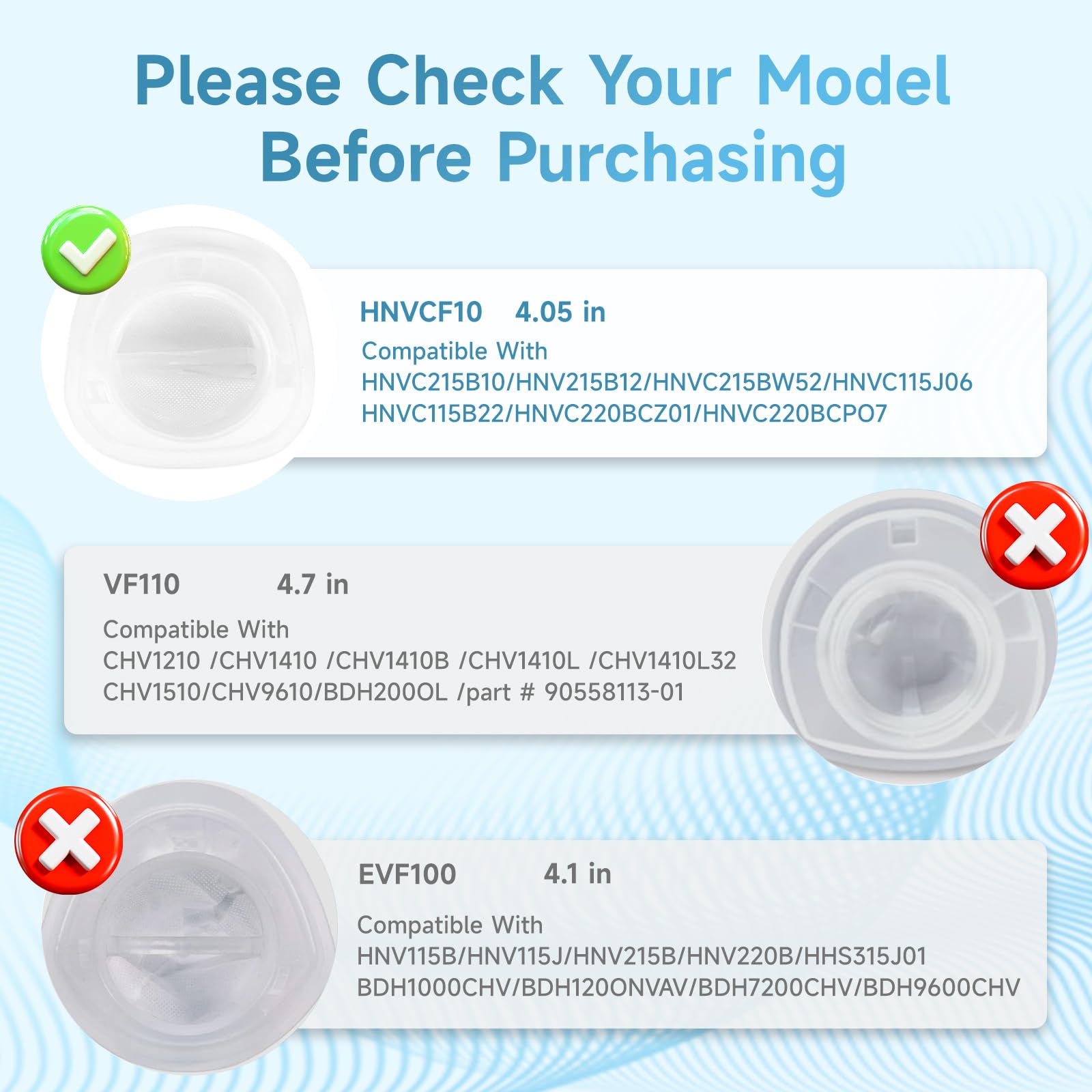 - Fit Models: The HNVCF10 filter is designed to compatible with black and decker handheld vacuums HNVC215B10, HNV215B12, HNVC215BW52, HNVC115J06, HNVC115B22, HNVC220BCZ01, HNVC220BCP07, HNVC115J22, HNVC115JB06, HNVC215B12 and HNVC220BCZ00 (Only fit for HNVC Series Model, NOT fit for HNV Series Model)