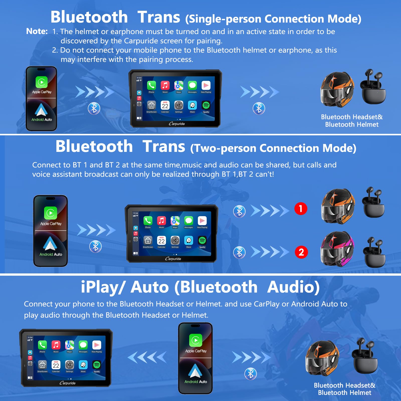 - 【Single & Dual Connection Modes】In BT Trans, the W702BS PRO CarPlay supports both single and dual connections, allowing you to pair Bluetooth headsets or helmets with ease, whether for solo use or sharing with a passenger. In CarPlay or Android Auto mode, only single connection is supported, enabling audio transmission from your smartphone to a helmet or headset for hands-free communication and music playback. R1250RT after 2021, 2019 R1250GS, 2019 R1250RT lack Native Wonder not fit carpuride BS