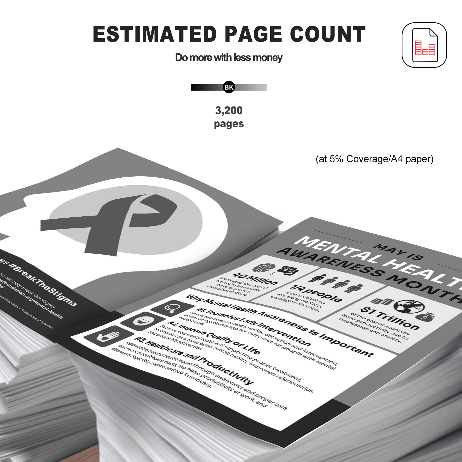- Print Pages: Approx to 3,200 pages per black E20 Toner Cartridge (based on 5% coverage of Letter size Paper).