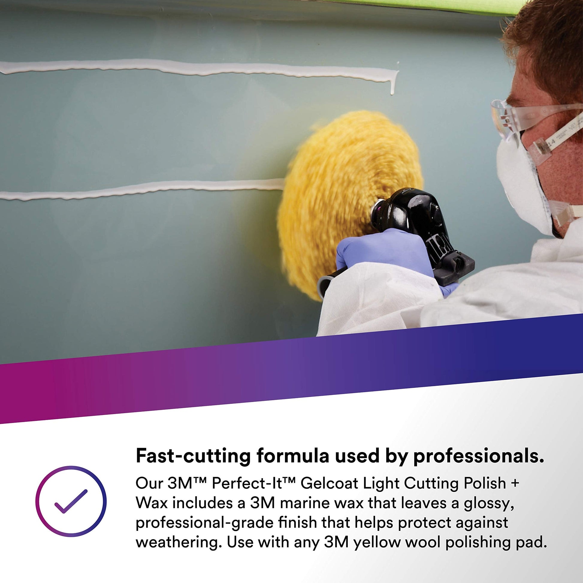 Details: Our 3M Perfect-It Gelcoat Light Cutting Polish+ Wax features a fast-cutting formula that removes small scratches, swirls and defects from gelcoat surfaces. Excellent for boats, personal watercraft and RVs, this marine compound combines a gelcoat polish and a durable wax – you can often polish and wax in one easy step. It is formulated to stay wet for a long time on the polishing pad and on the surface, so you don’t need to stop polishing as often to change pads or apply more material. It also includes a 3M marine wax that leaves a glossy, professional-grade finish that helps protect against weathering. 3M Perfect-It Gelcoat Light Cutting Polish + Wax is part of a family of gelcoat finishing products. 3M Perfect-It Boat Wash, 3M Perfect-It Gelcoat Heavy Cutting Compound, 3M Perfect-It Gelcoat Medium Cutting Compound + Wax and 3M Perfect-It Boat Wax are all available for every type of boat and RV maintenance. Use with any 3M yellow wool polishing pad.