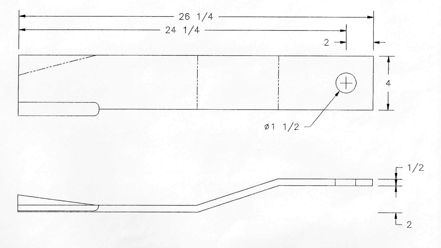 - Dimensions: This rotary blade is 4 in. x 26-1/4 in. x 1/2 in. with a 1-1/2 in. bolt hole. The width at edge, the widest point, is 4-1/2 in.