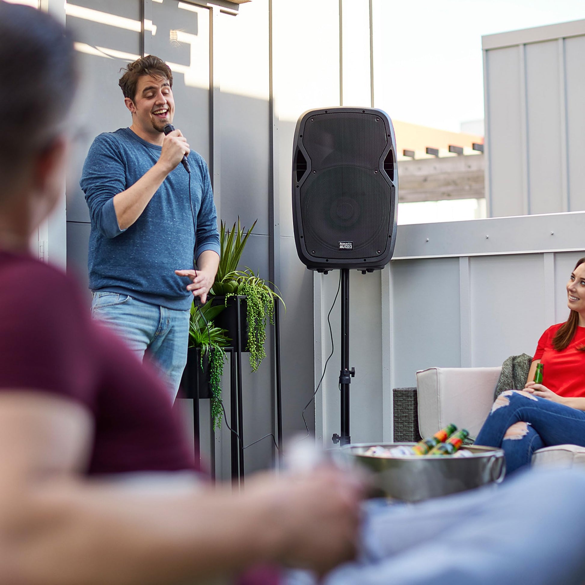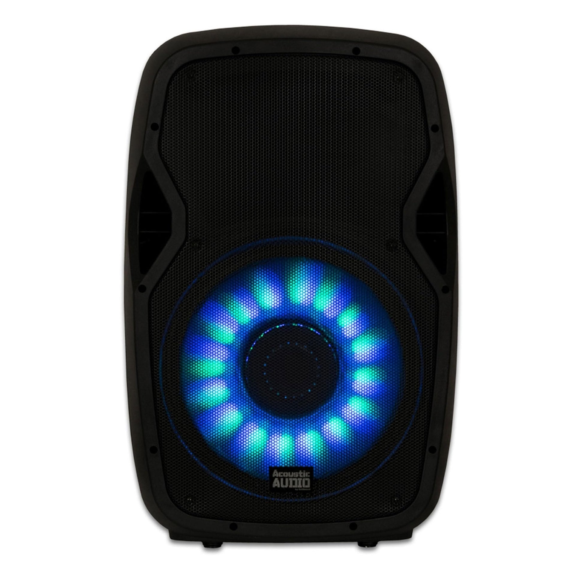 Details: Take your home and outside events to the next level with the Acoustic Audio by Goldwood AA15LBS Powered 15' Flashing LED 1000W Bluetooth Speaker Set. This high-performance Bluetooth speaker system delivers clear, powerful sound with its built-in 1000 watt amplifier, perfect for ultimate entertainment at parties, DJ sets, karaoke, and live performances. Whether indoors or outdoors, this speaker box ensures you’re heard with dynamic clarity across any venue, making it a must-have for your house. Enhance your experience with the vibrant multi-colored LED light display of this karaoke speaker that syncs to your music, creating a dazzling show. The lights in this microphone and speaker set can be switched off for more formal events, offering versatility in any setting. Seamlessly stream music in this home speaker system via Bluetooth, or use the FM tuner, USB drive, SD card slot, and multiple input options like RCA, 1/4 inch mic, instrument, and AUX inputs. Control your audio in this DJ speakers set with the five-band graphic equalizer and volume knobs for mics, echo, and master control, allowing you to customize your sound. Plus, the RCA line level output of this Bluetooth speaker with lights lets you link another powered speaker for an even bigger sound. Built for portability, the AA15LBS speaker with aux input features rear wheels, handles, and an adjustable stand for easy transport. Whether it’s a tailgate, beach party, or garage jam session, this sturdy sound system goes wherever you need it. This all-in-one Bluetooth sound system comes ready to go with a powered rugged Bluetooth speaker, stand, wired microphone, and remote, ensuring you have everything you need for any event.