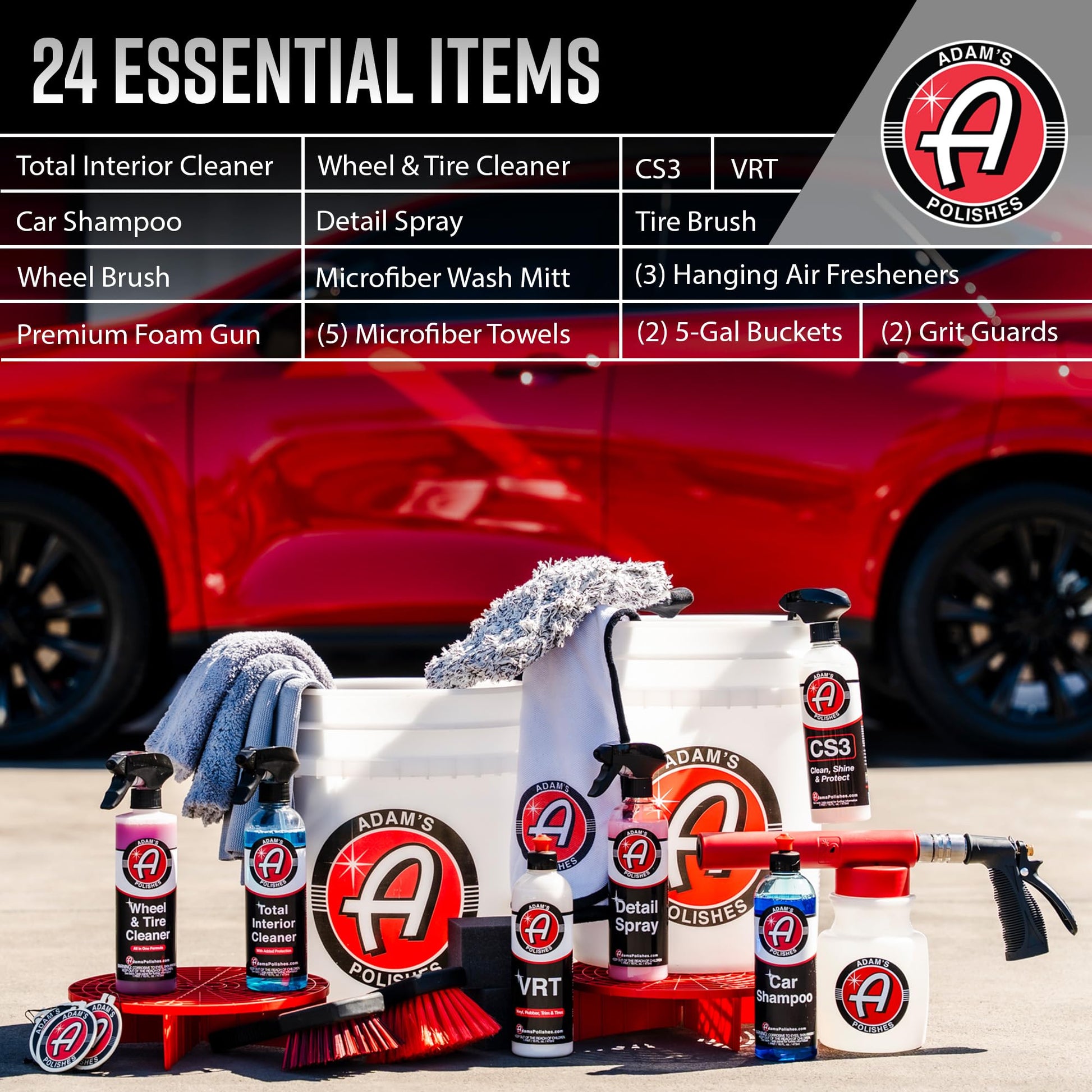 Adam's Essential Car Wash Kit (24-Item) - Auto Detailing Car Care Cleaning Kit with Foam Gun & Bucket Car & Truck Lovers, Dads, Moms and DIYers