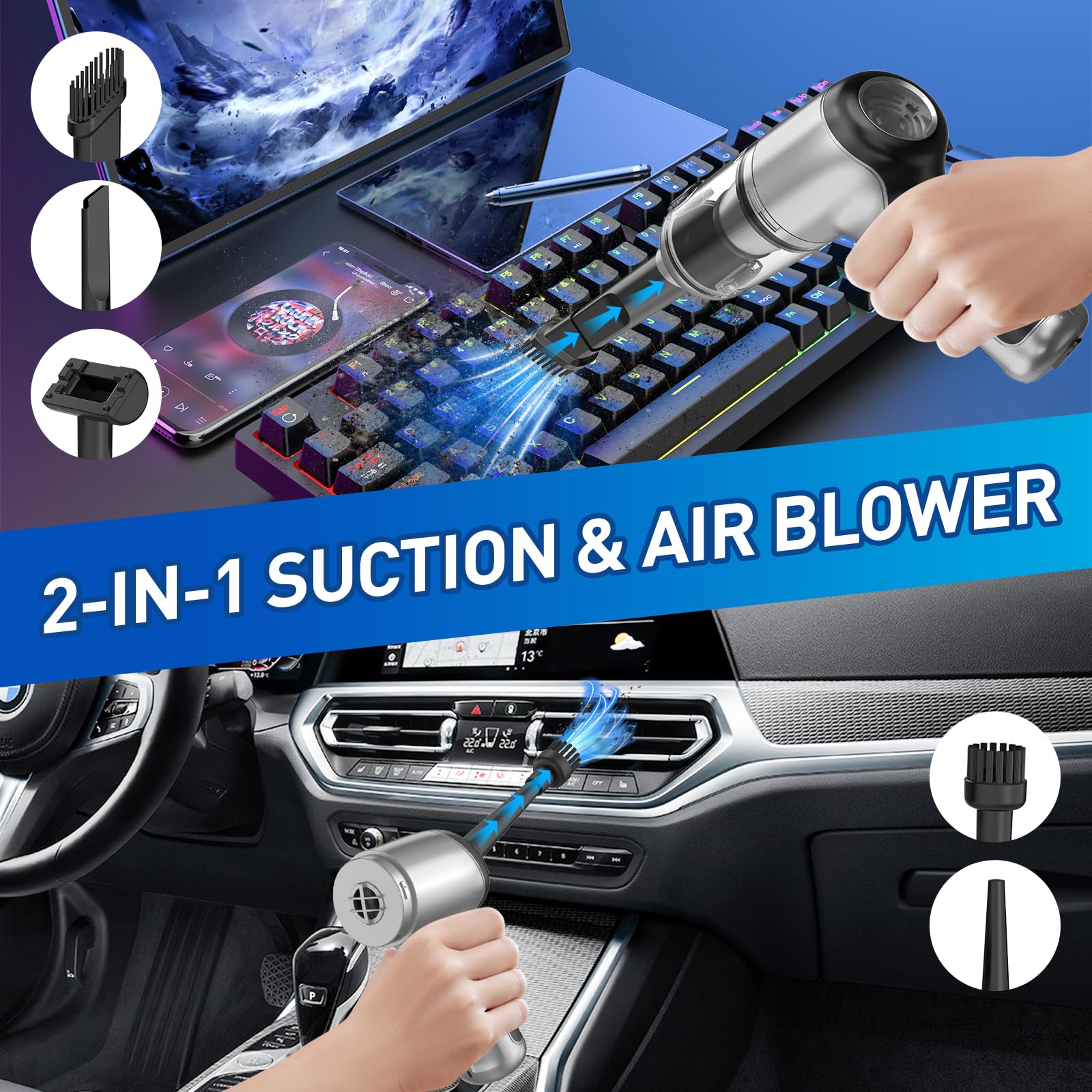 - ☑️【3-in-1 MULTI-FUNCTION VACUUM CLEANER】Car vacuum cleaner comes with a variety of accessories for blowing, sucking, and inflating multiple scenarios of use. The strong suction power used with the floor brush, nozzle brush and other suction accessories can effortlessly pick up a variety of garbage such as dust, crumbs, grit and more. The other end of the vacuum cleaner is the blowing and inflating function, using the long nozzle accessory you can easily blow dust off keyboards and crevices, or inflate balloons, swim rings and more