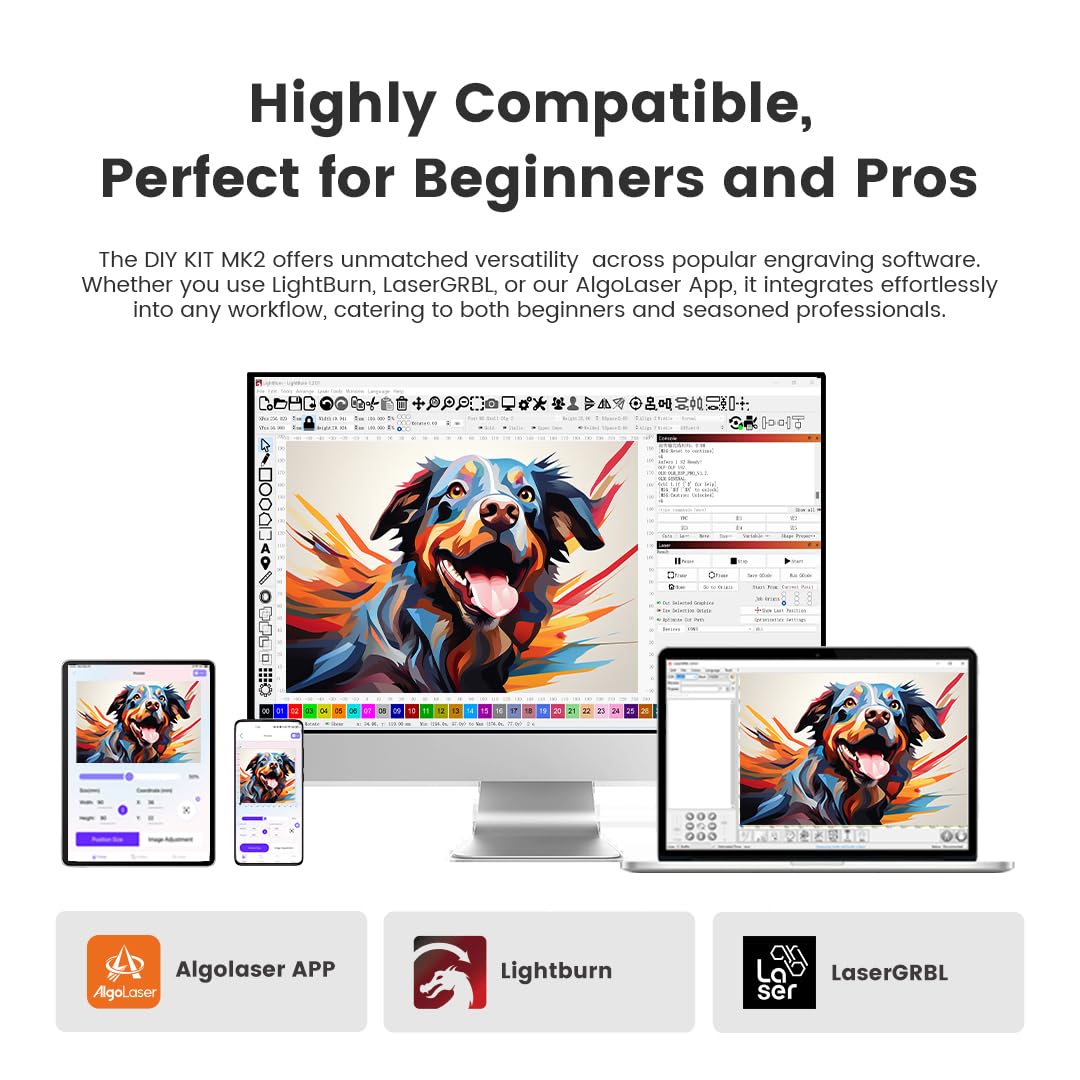 - Versatile Connectivity and Compatibility:Compatible with AlgoLaser APP, LightBurn, and LaserGRBL. Easily connect via USB Type-C, WiFi, or the included 32GB TF card. Supports both mobile and desktop operation. The system remembers previous settings, making repeated tasks faster and more efficient—ideal for flexible, cross-platform workflows.
