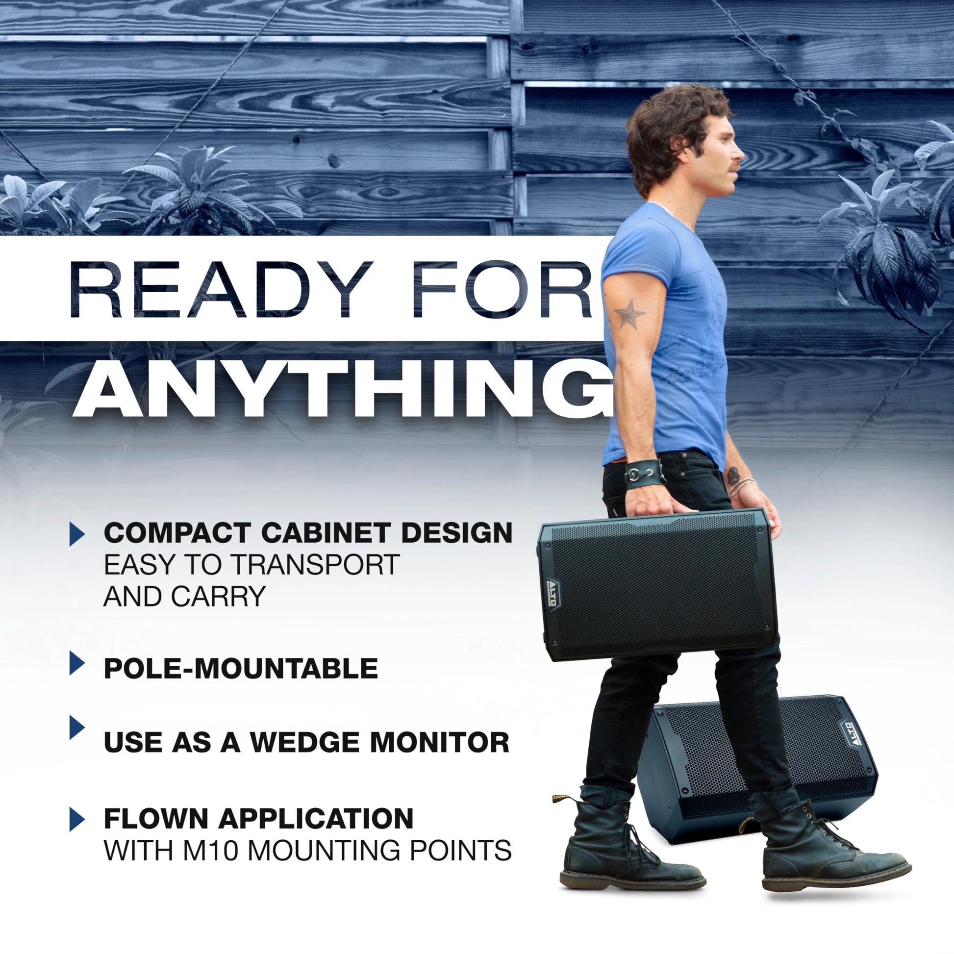 Each speaker features a lightweight, sleek, black box design that can be used as the application demands - freestanding, as a wedge monitor, pole-mounted, or suspended via the integrated suspension points.