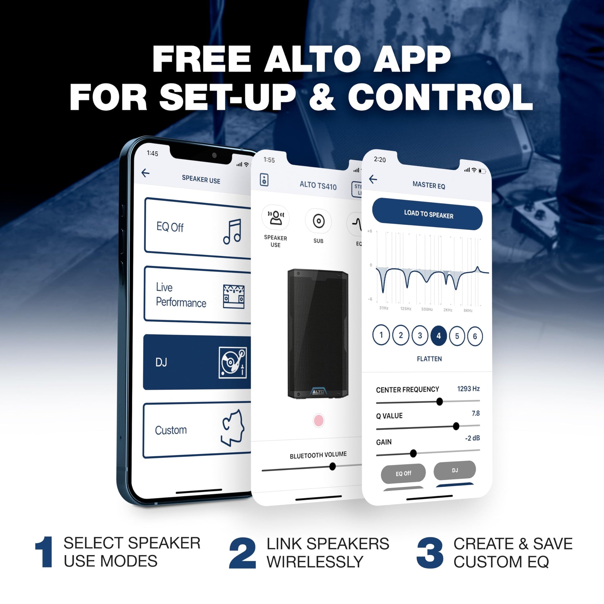 - ALTO App - Compatible with iOS and Android for remote configuration and control over Bluetooth levels, Speaker Use modes, Sub Size selection, and Custom EQ to remove unwanted feedback