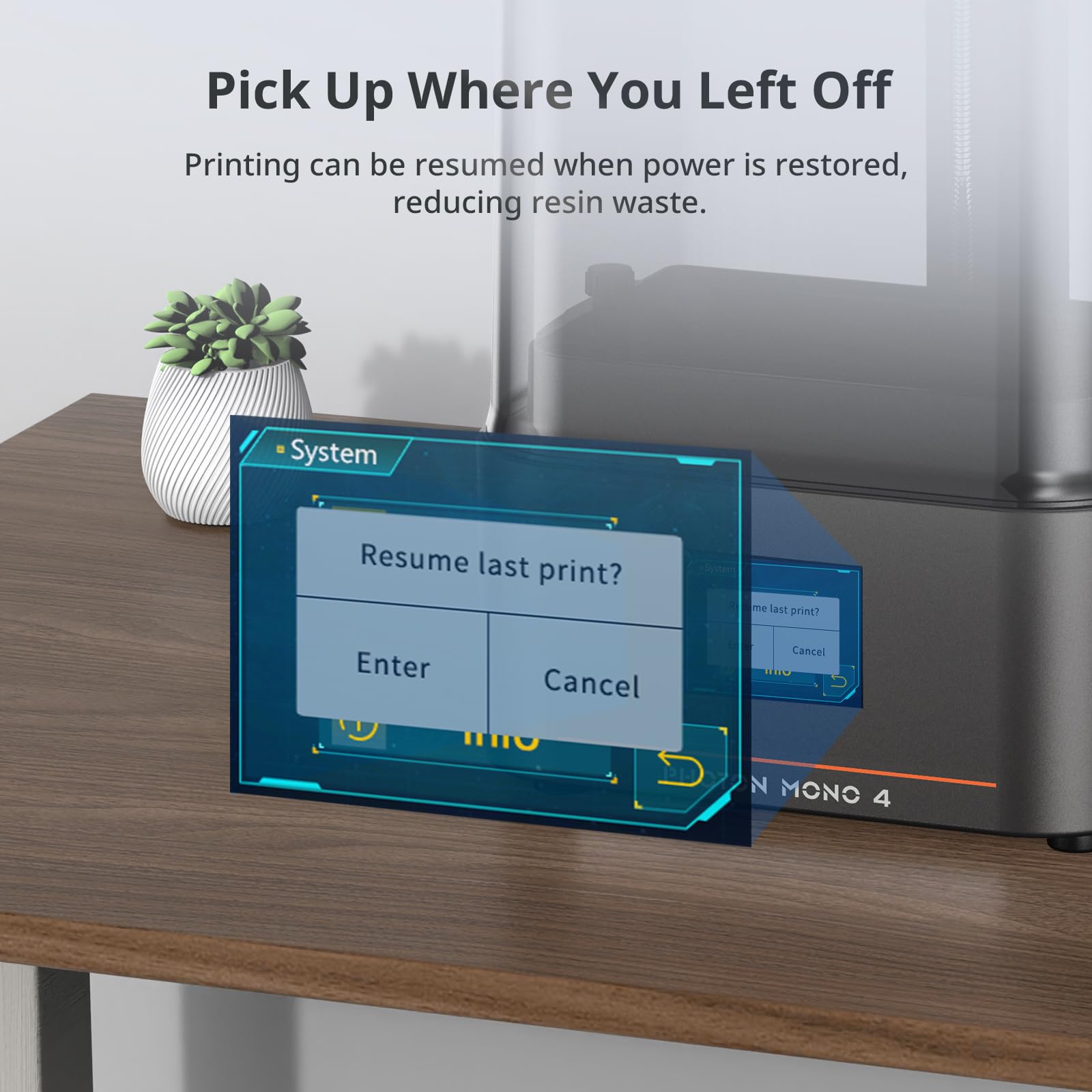 - 【User-friendly Function】The 4-point leveling method is ideal for beginners, after the first leveling and tightening the 4 screws, no need to repeat leveling. Photon mono 4 can resume printing when power is restored, effectively reducing material and time wastage.