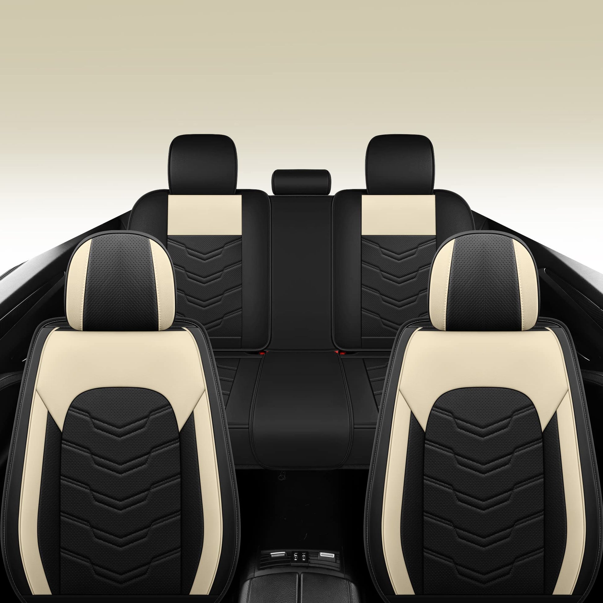 AOOG Leather Car Seat Covers 5 PCS Full Set, Breathable Faux Leatherette Automotive Seat Covers, Non-Slip Interior Covers Waterproof for Most Sedans SUV Trucks,Airbag Compatible,Beige&Black