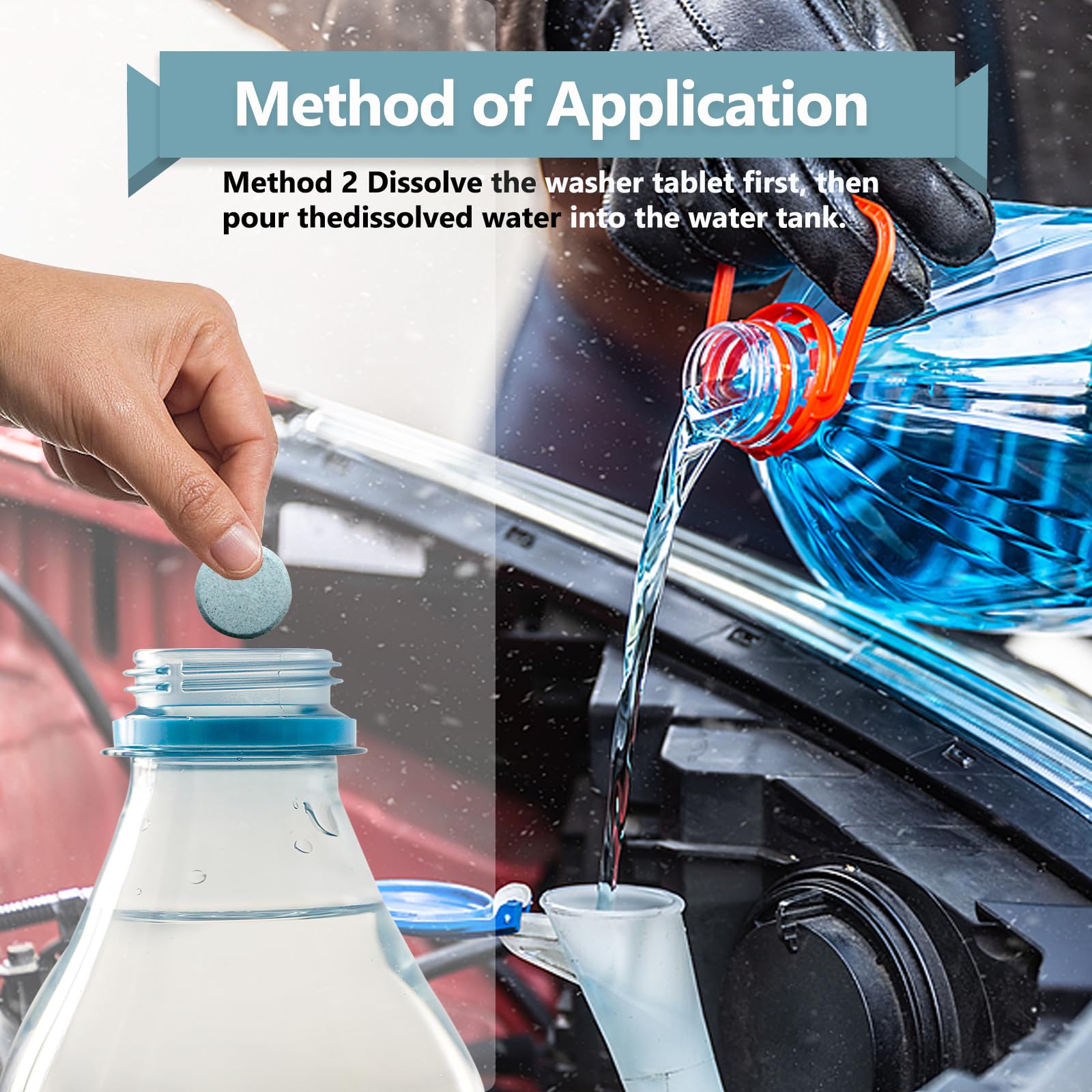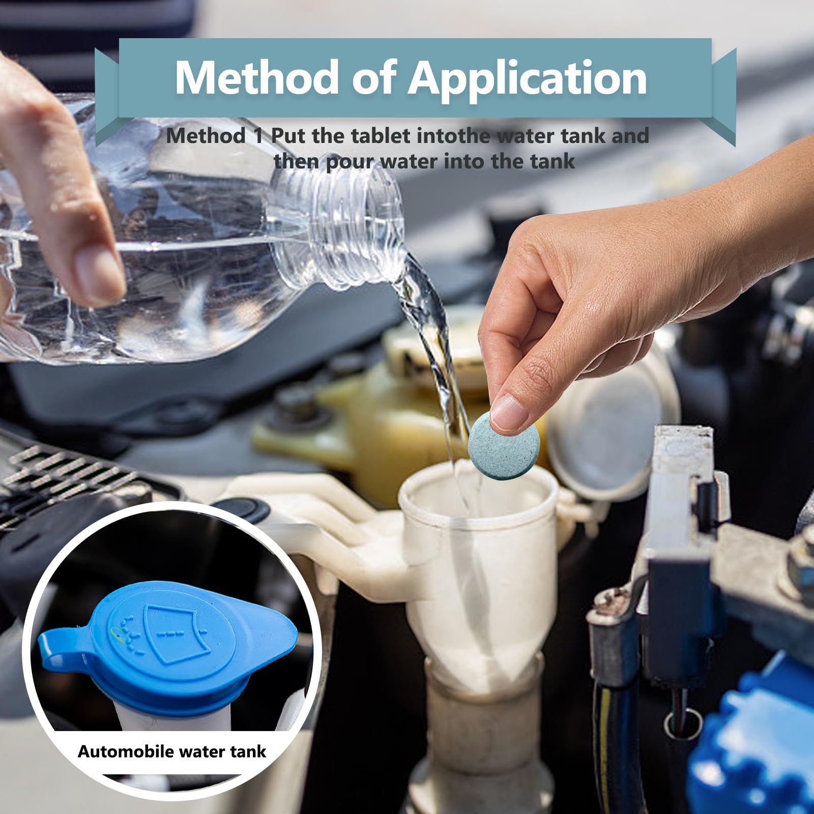 - Easy to use: You only need to open the water tank cover and pour in water, then put the car windshield cleaning sheet into the water tank and wait for 15 to 20 minutes before you can start cleaning your windshield (if conditions permit, you can dissolve the product in a container and then put it into the car water tank. )