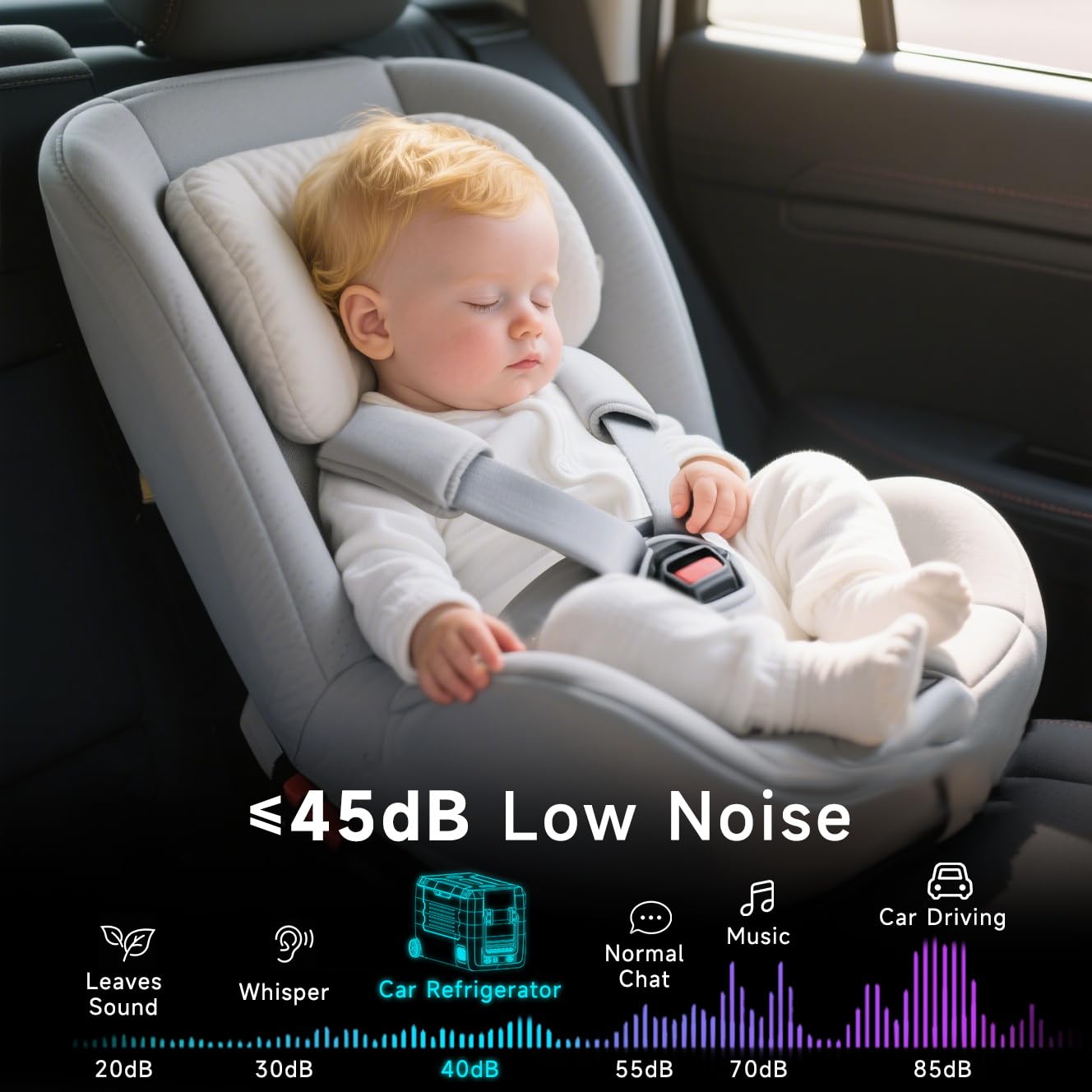 - This car fridge utilizes low noise technology and the 12v refrigerator operates at less than 45 dB, making its presence almost imperceptible while you are driving or resting. In addition, the electric cooler has an anti-vibration design, which can run smoothly on a 30-45 degree inclined road surface, ensuring the safe storage of food and beverages.