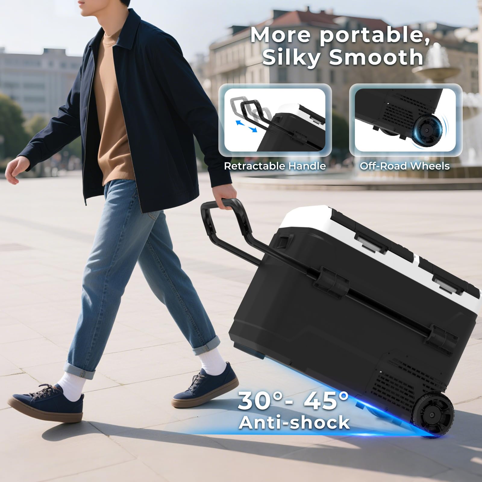 AS 12 Volt Refrigerator, 42QT(40L) Dual Temperature Zone Electric Cooler with Wheels, Portable Freezer 12V/24V DC 110-240V AC, -4℉-68℉ Car Fridge for Car, Marine, Home, Outdoor, etc