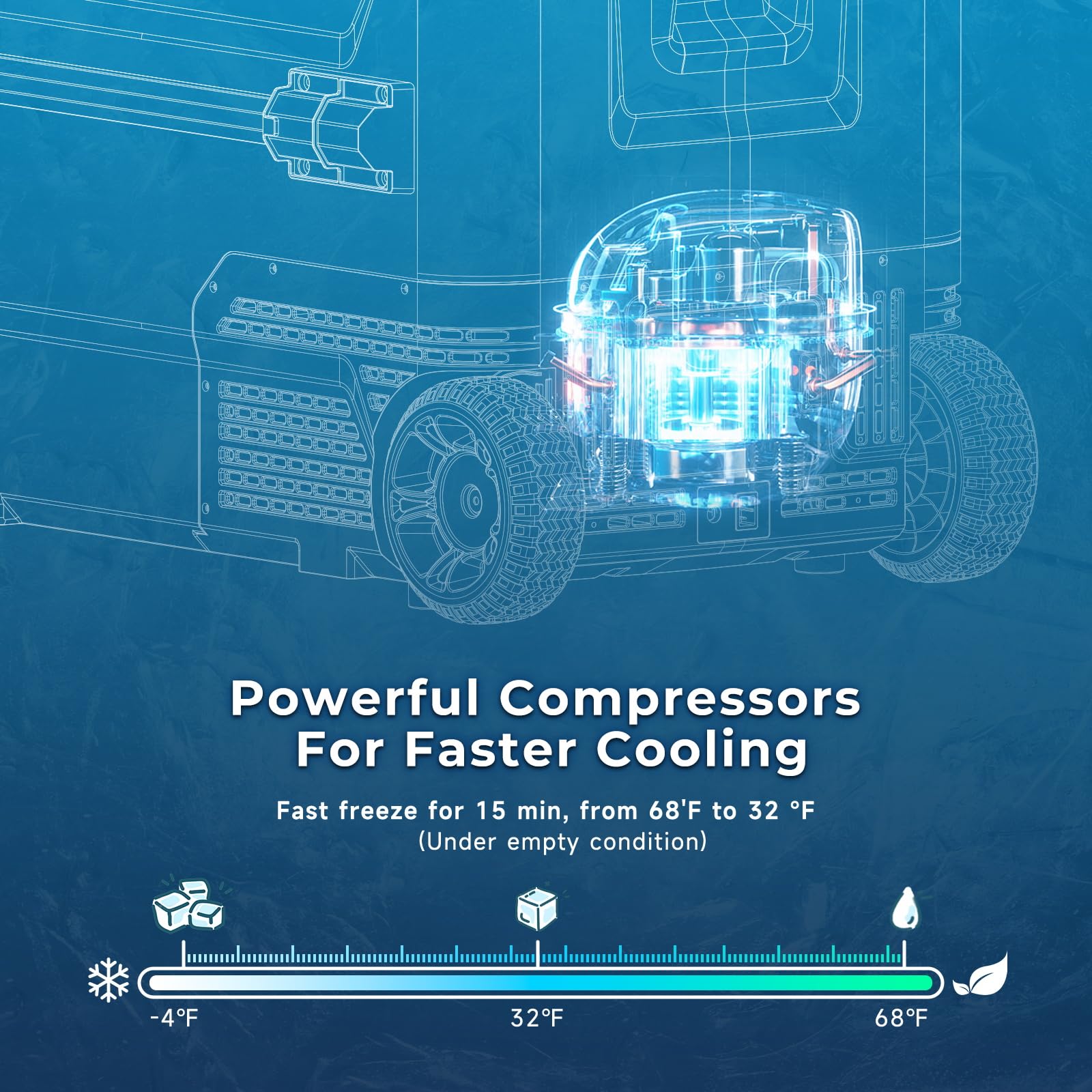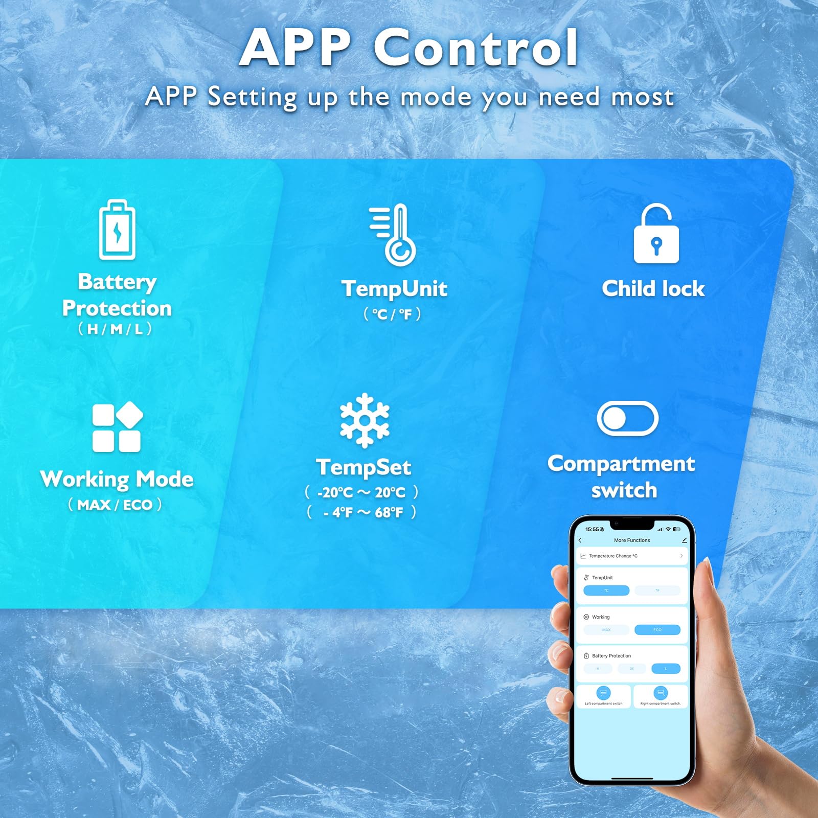 - Energy Saving and Battery Protection: This car refrigerator features fast cooling and energy saving modes.MAX mode provides fast cooling, down to 32°F in 15 minutes, with a -4 °F to 68 °F cooling range to meet your cooling needs. ECO mode maintains the ideal low temperature with lower energy consumption. The low, medium and high level battery protection prevents the car from not starting due to a low battery, ensuring the safety and longevity of the car battery.