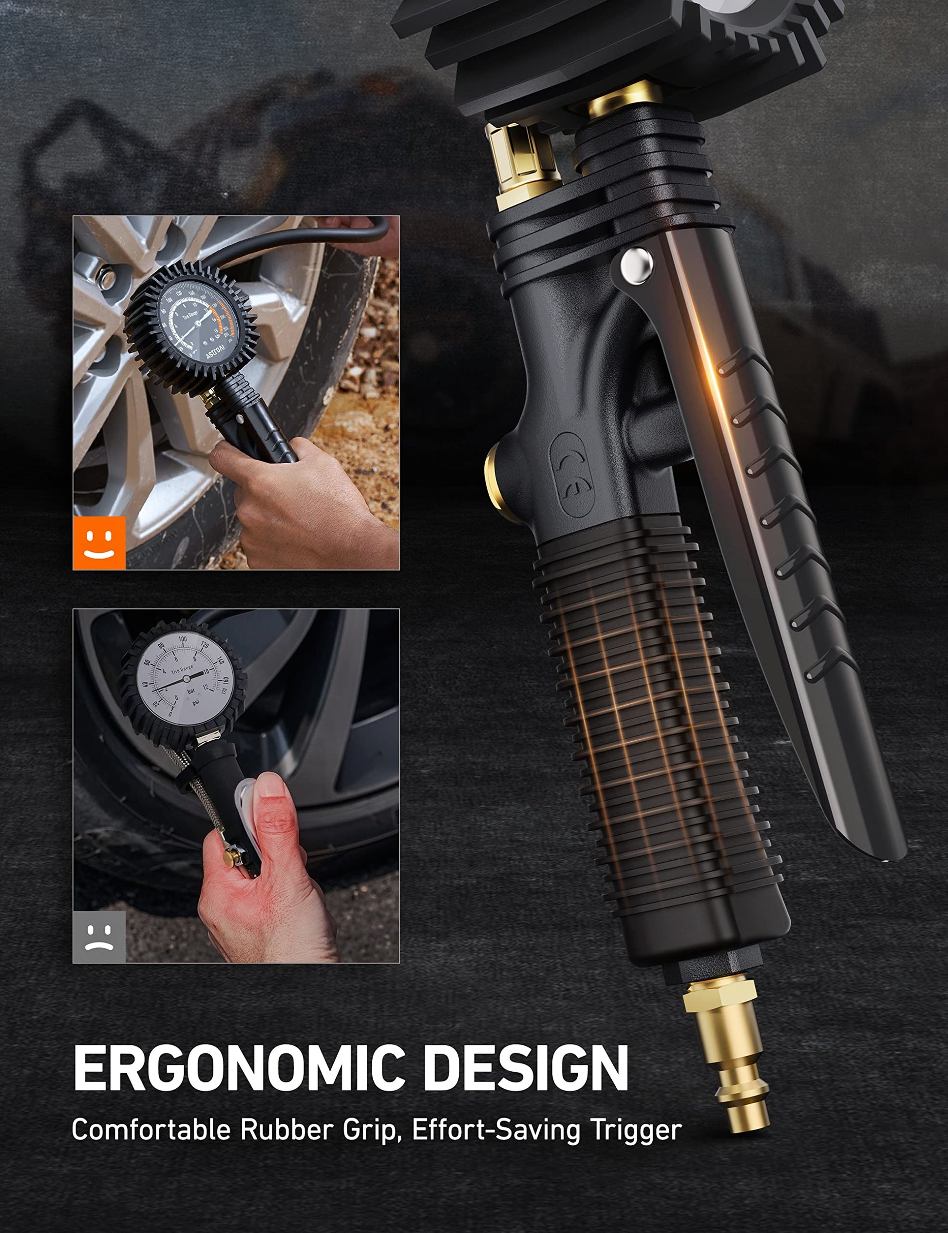 - Intuitive Operation: Large 2.6' easy-read dial glows in the dark for high visibility at night. Its 19.6'' heavy-duty rubber hose with 360° swivel air chuck is very convenient to use (dual-head air chuck included).