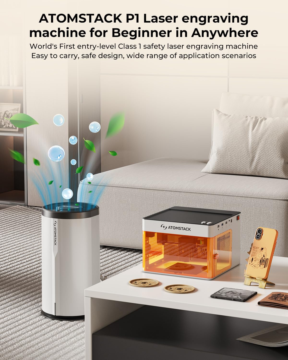 - Safe & easy for beginners, FDA/Class 1: ATOMSTACK P1 5W is the world’s first entry-level Class 1 laser engraver. Fully enclosed with auto-shutdown on tilt, enclosure detection, and USB safety lock. Viewing window and international safety certifications ensure extra protection—no goggles needed. Safe for home, office, or classroom. Built-in fixed-focus rod allows quick setup and eye protection. Start engraving in minutes—ideal for beginners