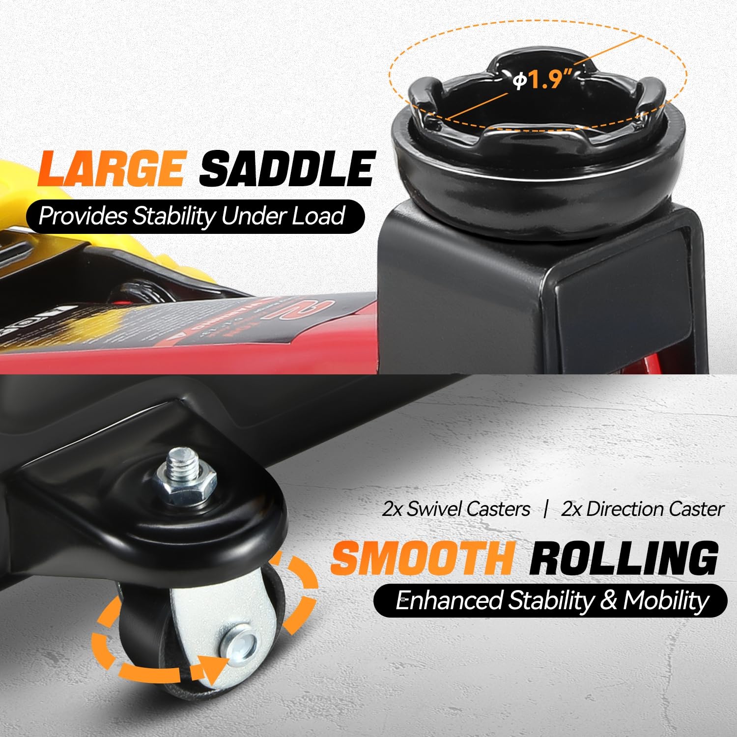 - 【Brilliant Performance】The hydraulic racing floor jack, with its large saddle, casters, and built-in dependable safety release valve triggers, can provide extra stability and help protect your vehicle.