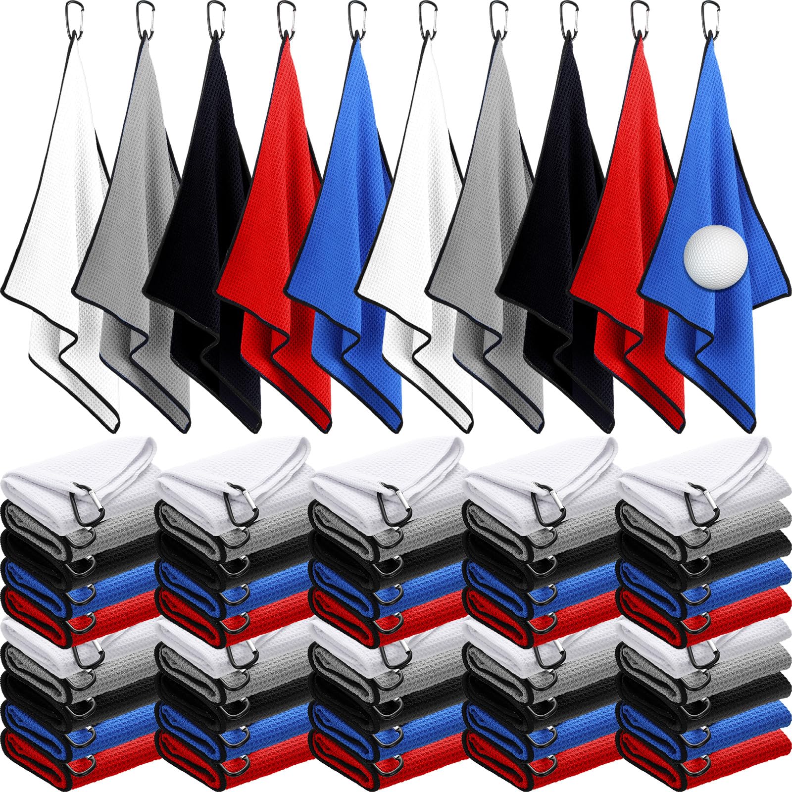 Batiyeer Golf Towels Bulk for Bags 16'' x 24'' Microfiber Waffle Pattern Golf Towels Trifold with Clip for Tournament, Hiking, Yoga(Classic Color,100 Pcs)
