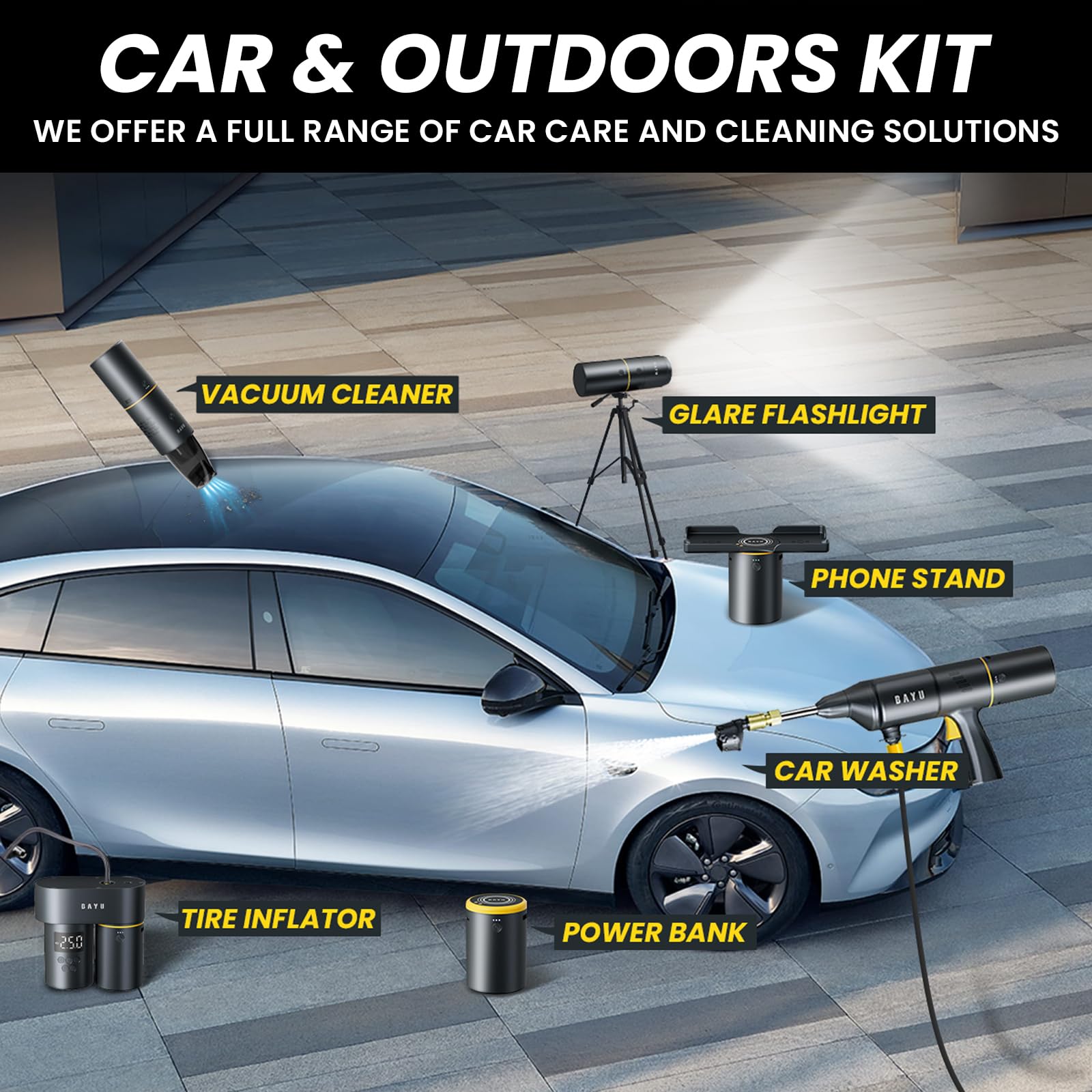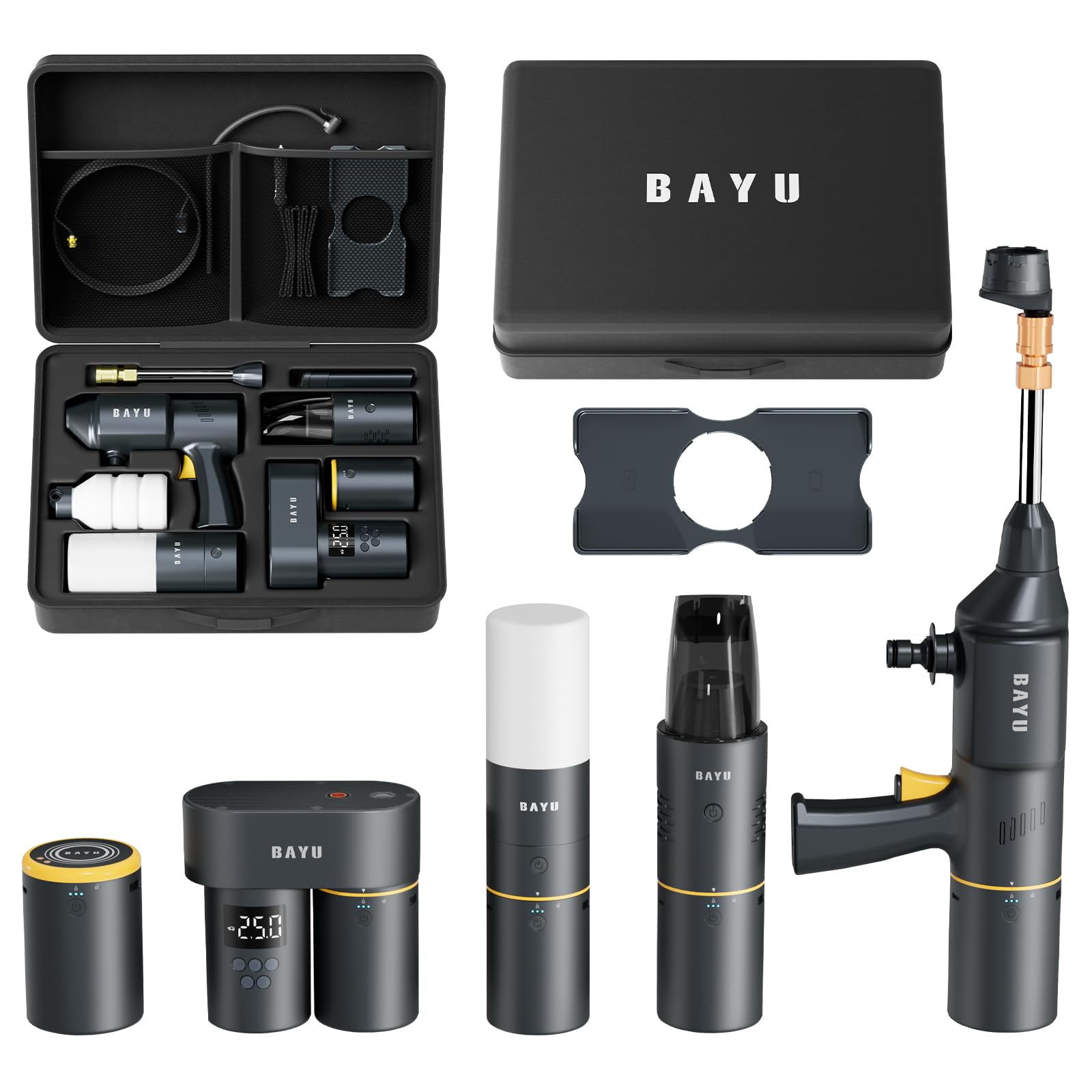 Details: This Car Supplies Set includes a Car Cleaning Kit (Portable Battery Pressure Washer with Foam Bottle, Hand Held Vacuum ), a Portable Inflator for Car Tires, a Portable Battery Pack, a flashlight, and cellphone stents. This kit is an ecological product that will develop more modules in the future, sharing a single battery module. The product is small and can be placed in a storage bag, which takes up little space in the user's car.
