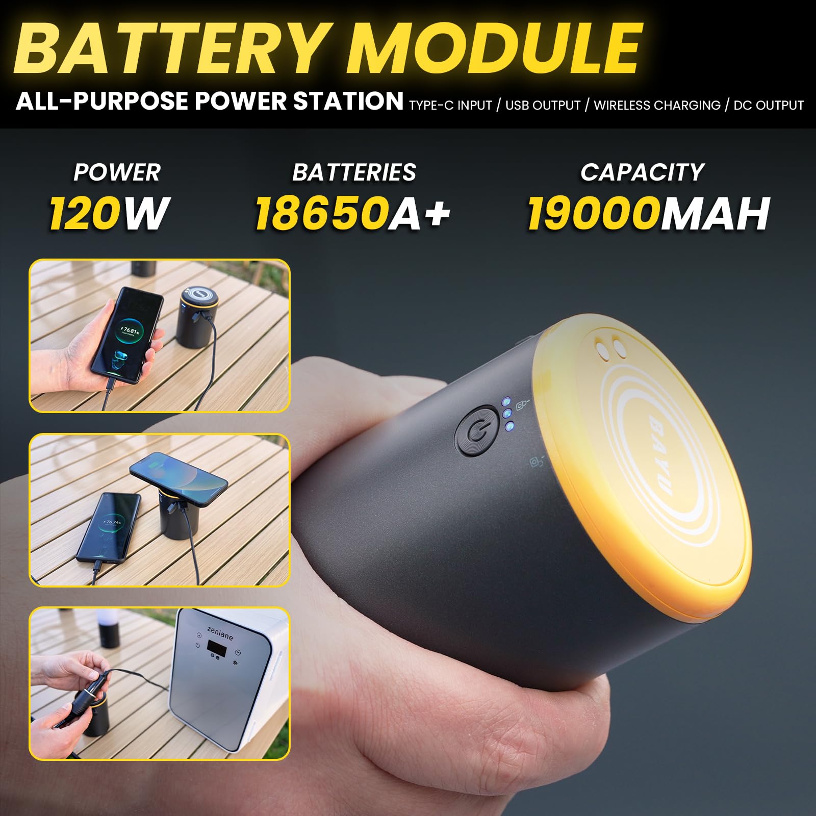 - ππππππ ππ πππππππ -This versatile battery can charge and use any of the BAYU kits. And the battery is universal. The body of the power bank is designed with interfaces such as type-C, USB, portable charger, and DC output. The interior uses an automotive-grade power battery pack with a large capacity of 19200mAh and a long battery life. It can work for a car washing machine for 40 minutes. Work on the vacuum cleaner for 60 minutes, work on the air pump for 40 minutes, work on the bright light for 9-20 hours, and charge 3 mobile phones. Its management system is designed with overchargeγ