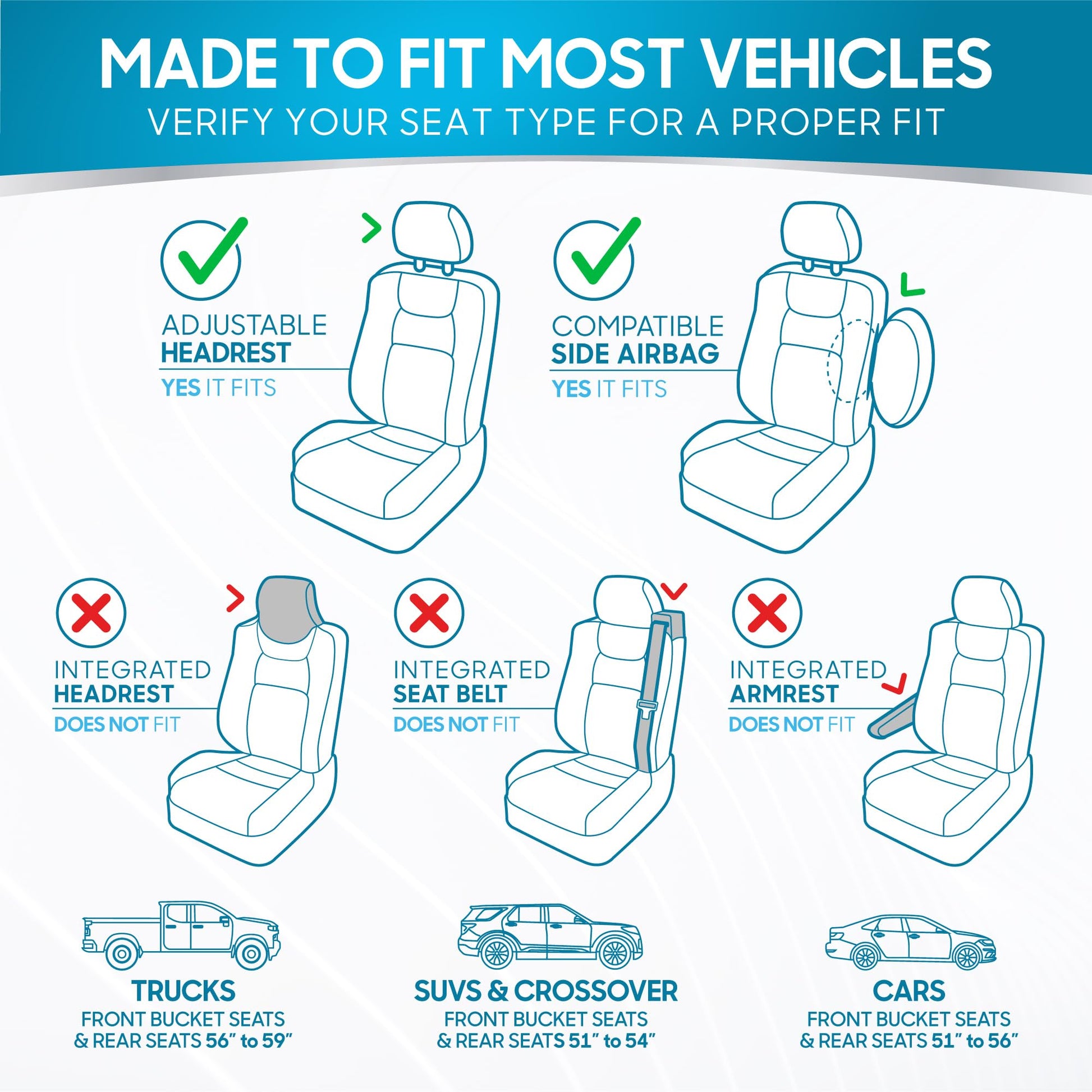 - UNIVERSAL FIT FOR MOST AUTOS: Our seat covers are designed to provide a snug and stylish fit for the majority of cars, trucks, vans, and SUVs. They are compatible with most vehicles that feature adjustable or removable headrests. Please note: these seat covers are not compatible with seats that have molded (non-adjustable) headrests, integrated seatbelts, or built-in armrests on the front seats.