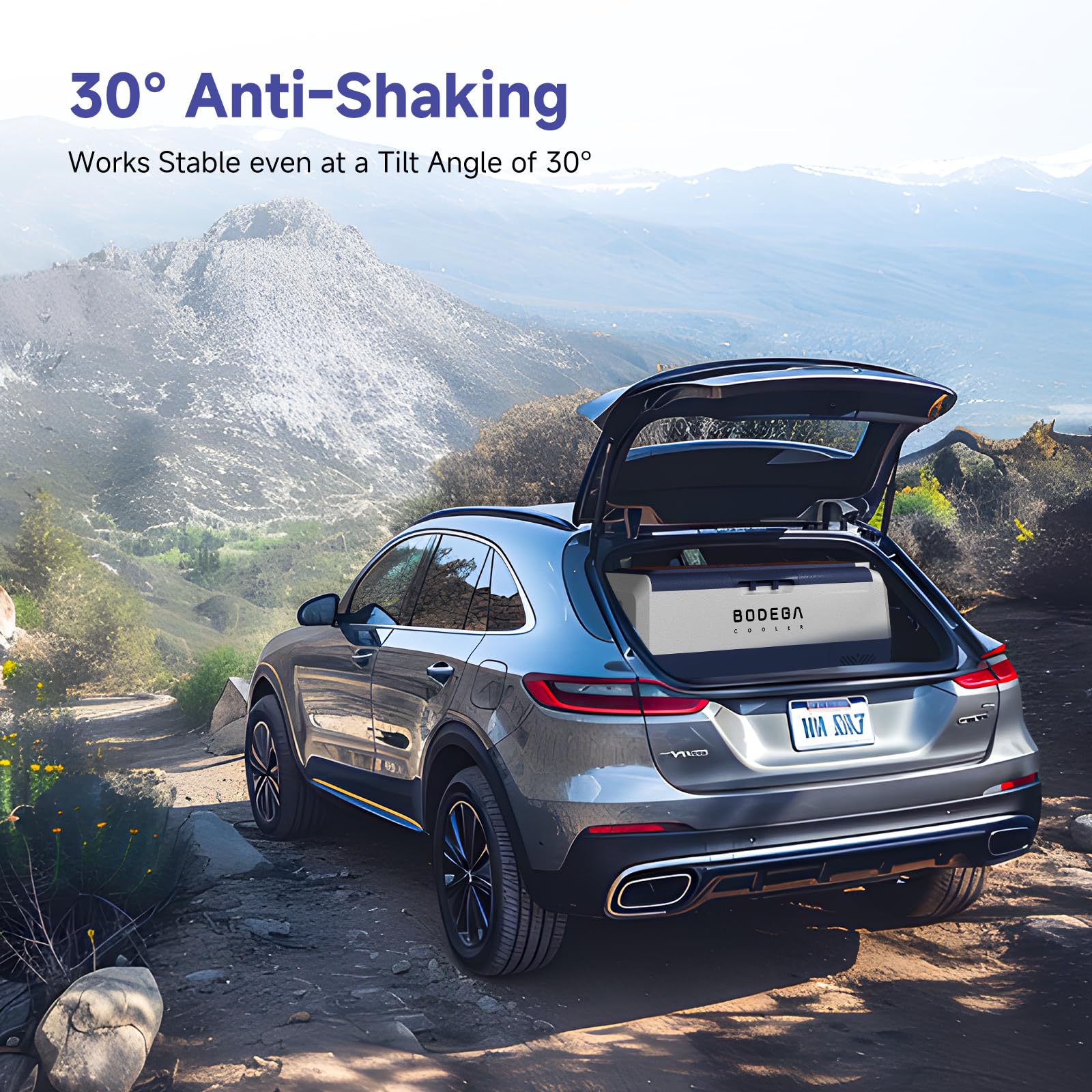 - ANTI-SHAKING: BODEGACOOLER 12v fridge provides a silent and comfortable environment for you.Because of its overall external smooth lines and equipped with a multi-functional non-slip base, the lateral displacement is greatly reduced. When your car is climbing at an inclination angle of 30 degrees, the car portable freezer can still run stably.Our portable car refrigerator allows you to enjoy cold drinks in stable and quiet during the trip.