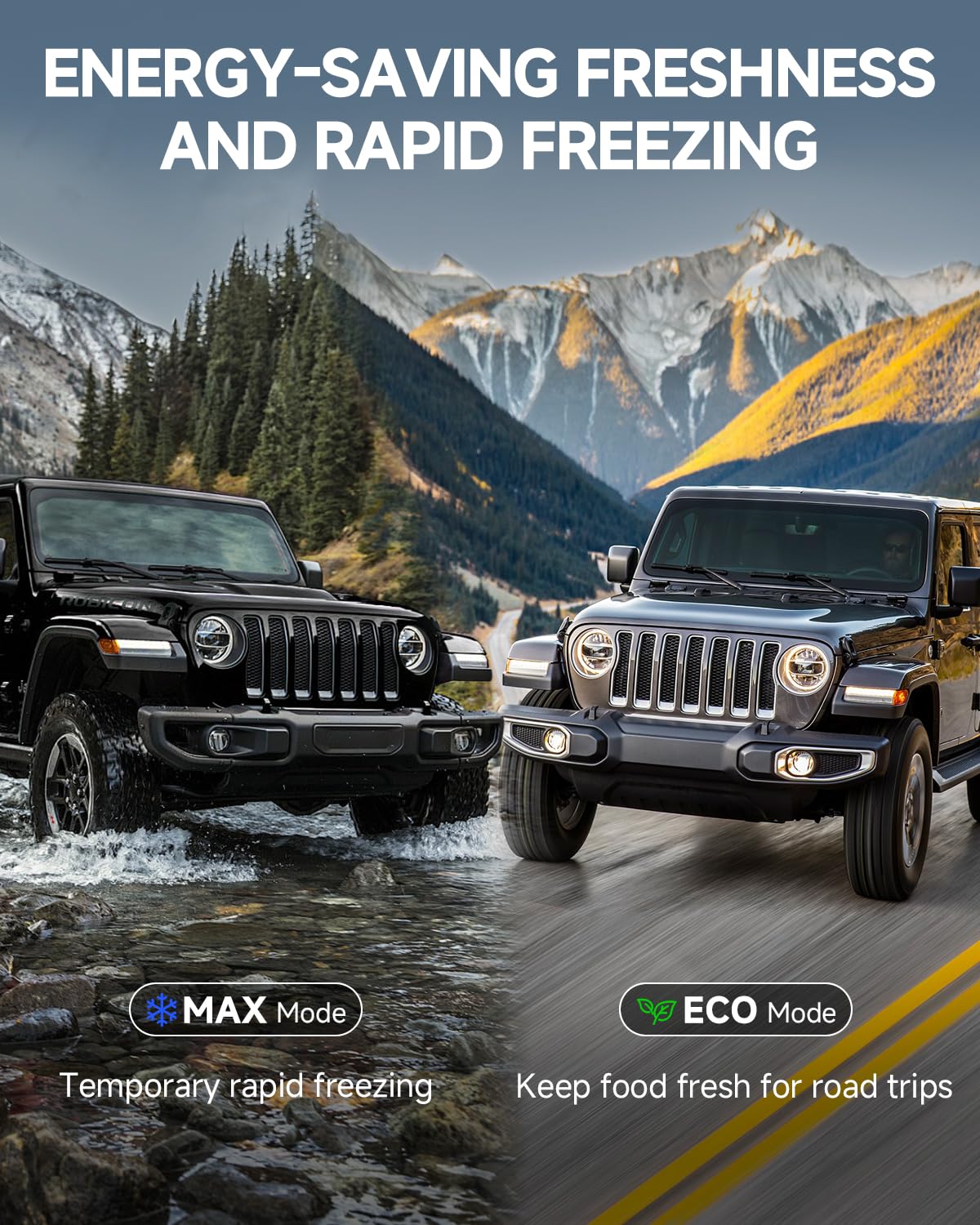 - 【Dual-Path Cooling】 BODEGA Car Fridge have a Switch-On-Fly Modes: MAX (15-min rapid chill) or ECO (40% extended runtime). Meet the needs of fast cooling and long-distance travel.