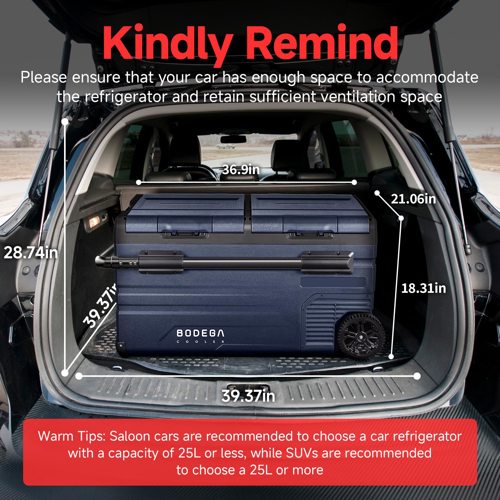 - DUAL ZONE CAR FREEZER:BODEGACOOLER car refrigerator Left zone 45.5L (48 Quart) + Right zone 29.5L (32 Quart) = 75L (80 Quart). You could control the temperature of dual zone independent. You could place meat, vegetable, drink and the other needs cold. BODEGACOOLER car refrigerator is best choice for camping, party, outdoor and travel.