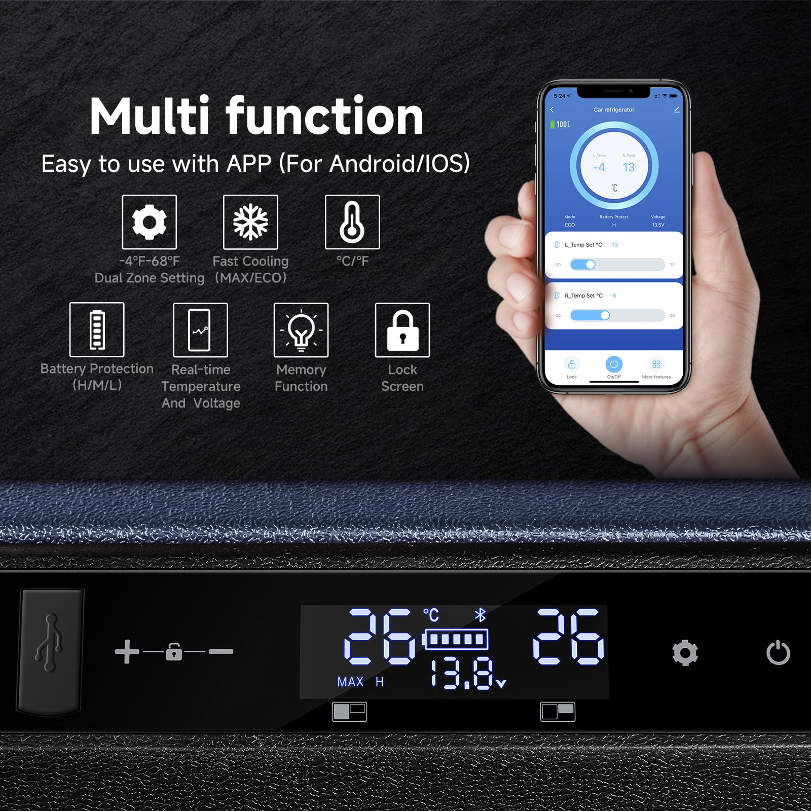 - APP CONTROL & VOLTAGE PROTECTION:Upgraded WiFi connection car refrigerator. BODEGACOOLER car fridge with APP control, you can control the freezer from distance or in car.Intelligent temperature control function to meet the required temperature of various ingredients. H/M/L 3-level low-voltage protection:When the measured DC voltage falls below the cut-off value, the compressor will off to prevent the vehicle from running out of power.