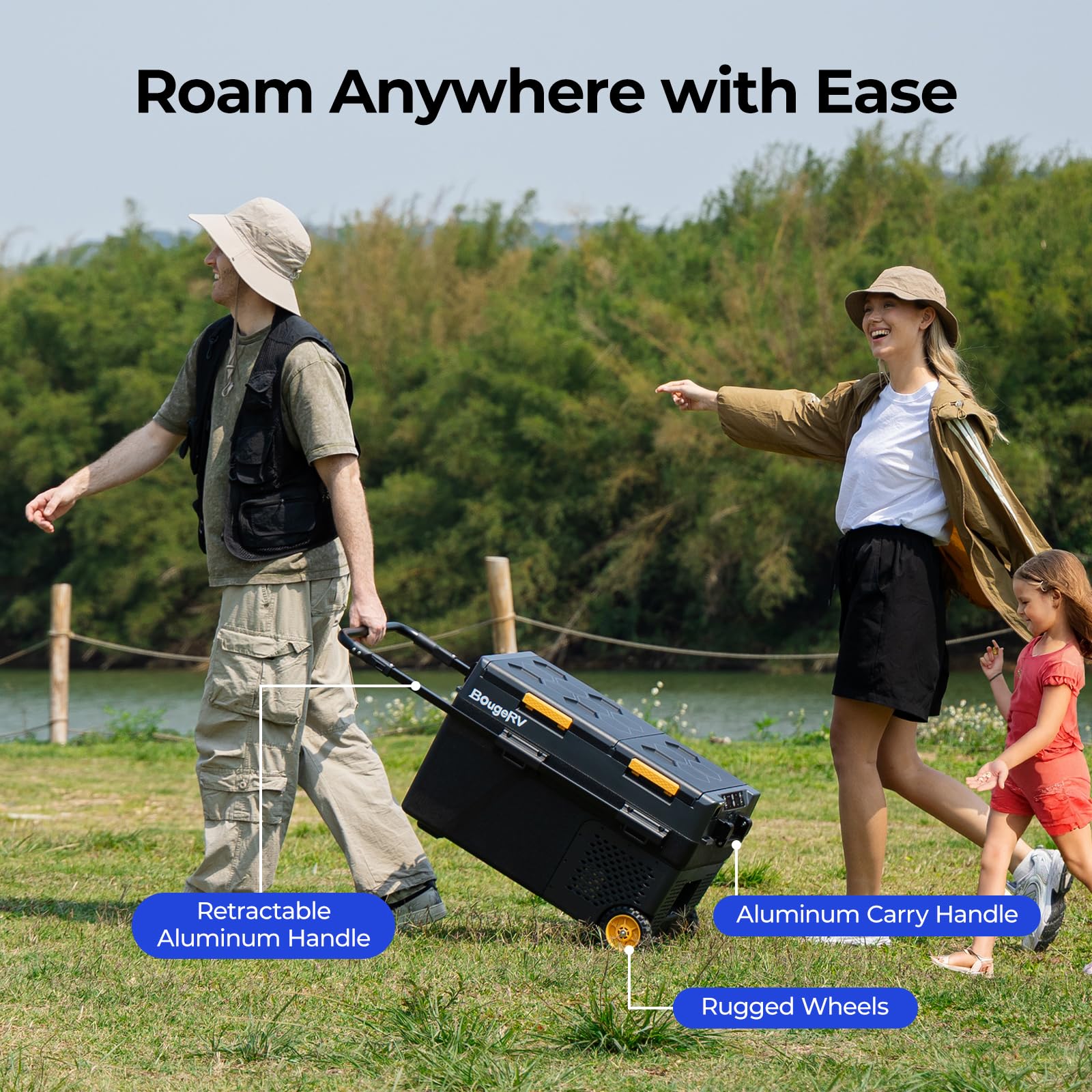 - Wheels & Handle for Easy Transport: This portable Dual Zone fridge comes with wheels and a telescopic handle, making it easy to transport from your car trunk to your campsite. Equipped with a solar charging port (60W max, 12V 5A), you can pair it with the BougeRV 173Wh battery and BougeRV 100W solar panel, extending its outdoor usage time