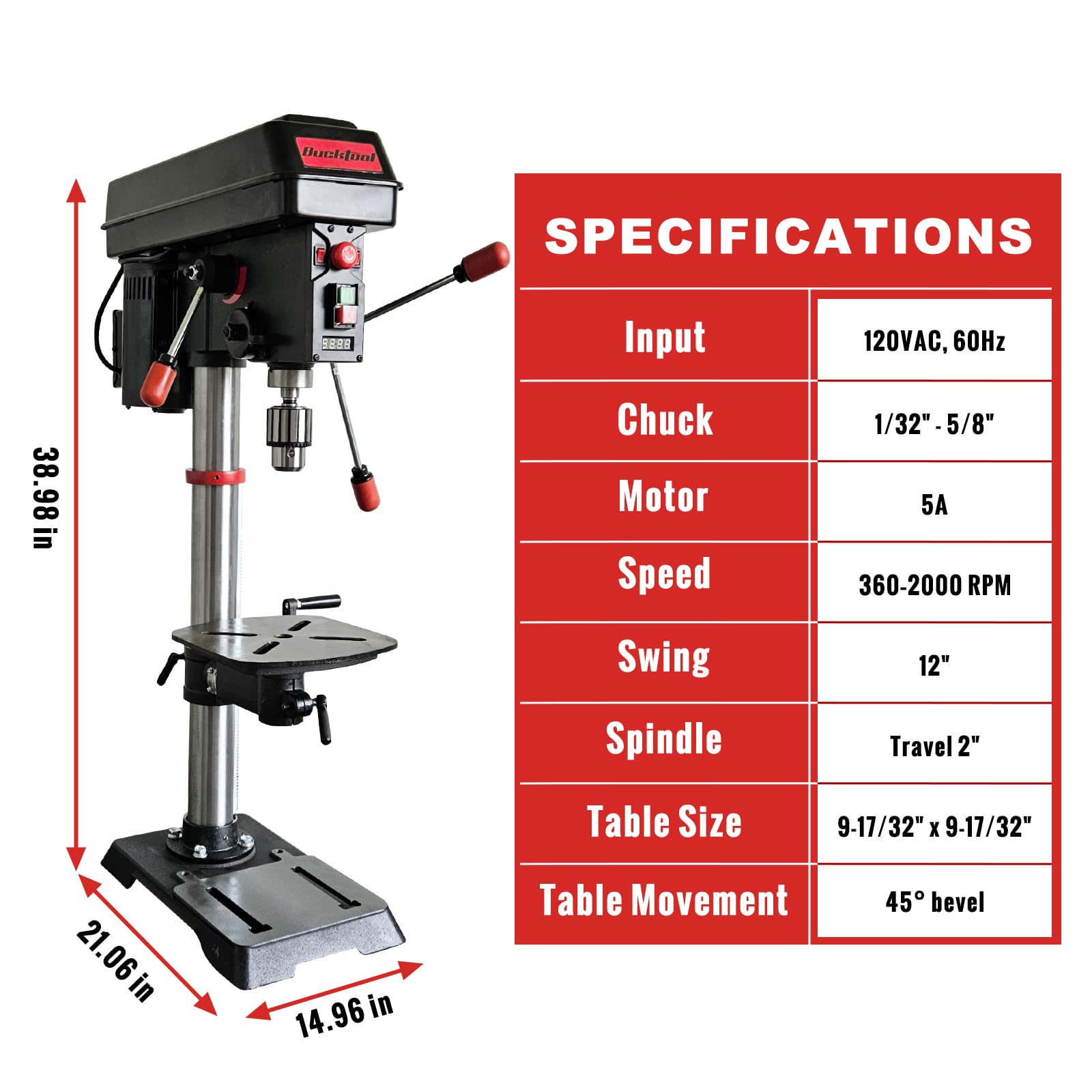 BUCKTOOL 12'' 6 Pole Motor Variable Speed Benchtop Drill Press 360–2000RPM, 3/4HP Powerful Bench Drill Press with Laser and Worklight, Low Speed Tabletop Drilling Machine for Metalworking, Woodworking