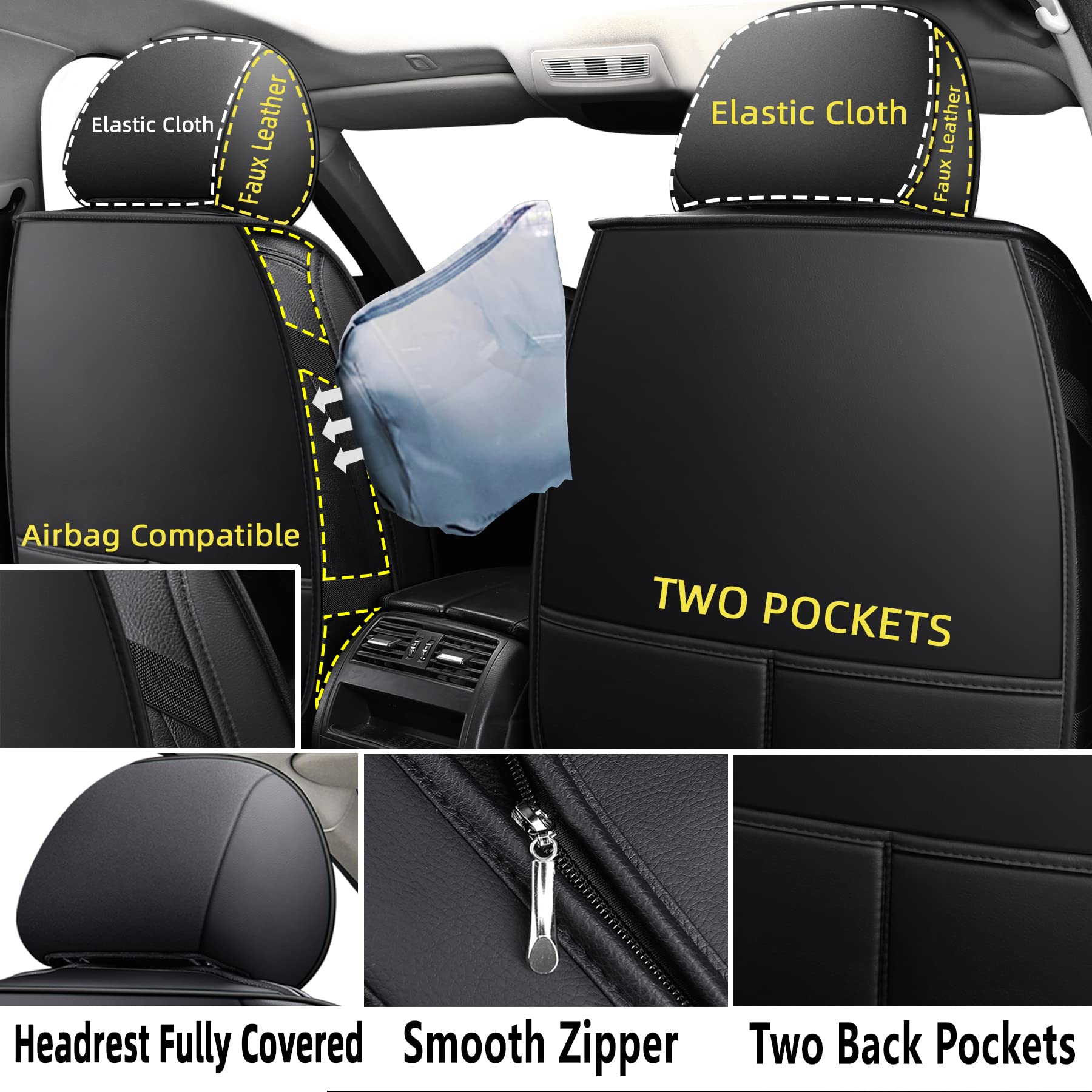 • Scratch-Resistant Synthetic Leather: Crafted with premium synthetic leather seat covers, these durable car seat covers repel spills and pet scratches. Wipe clean instantly! Luxe full-coverage headrests elevate your interior
