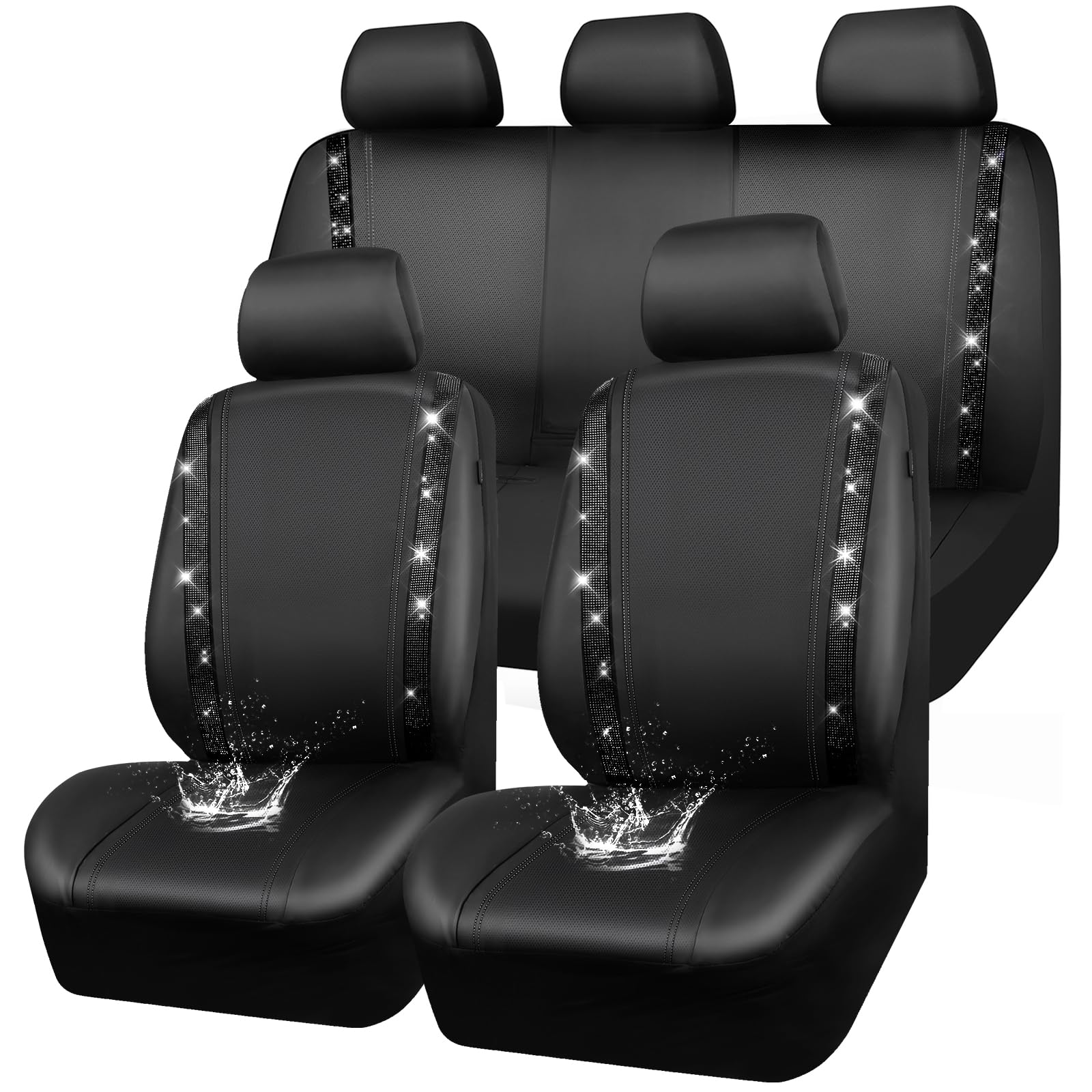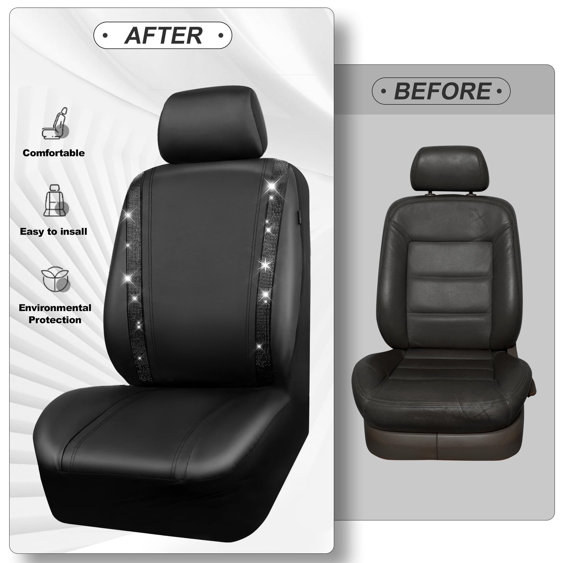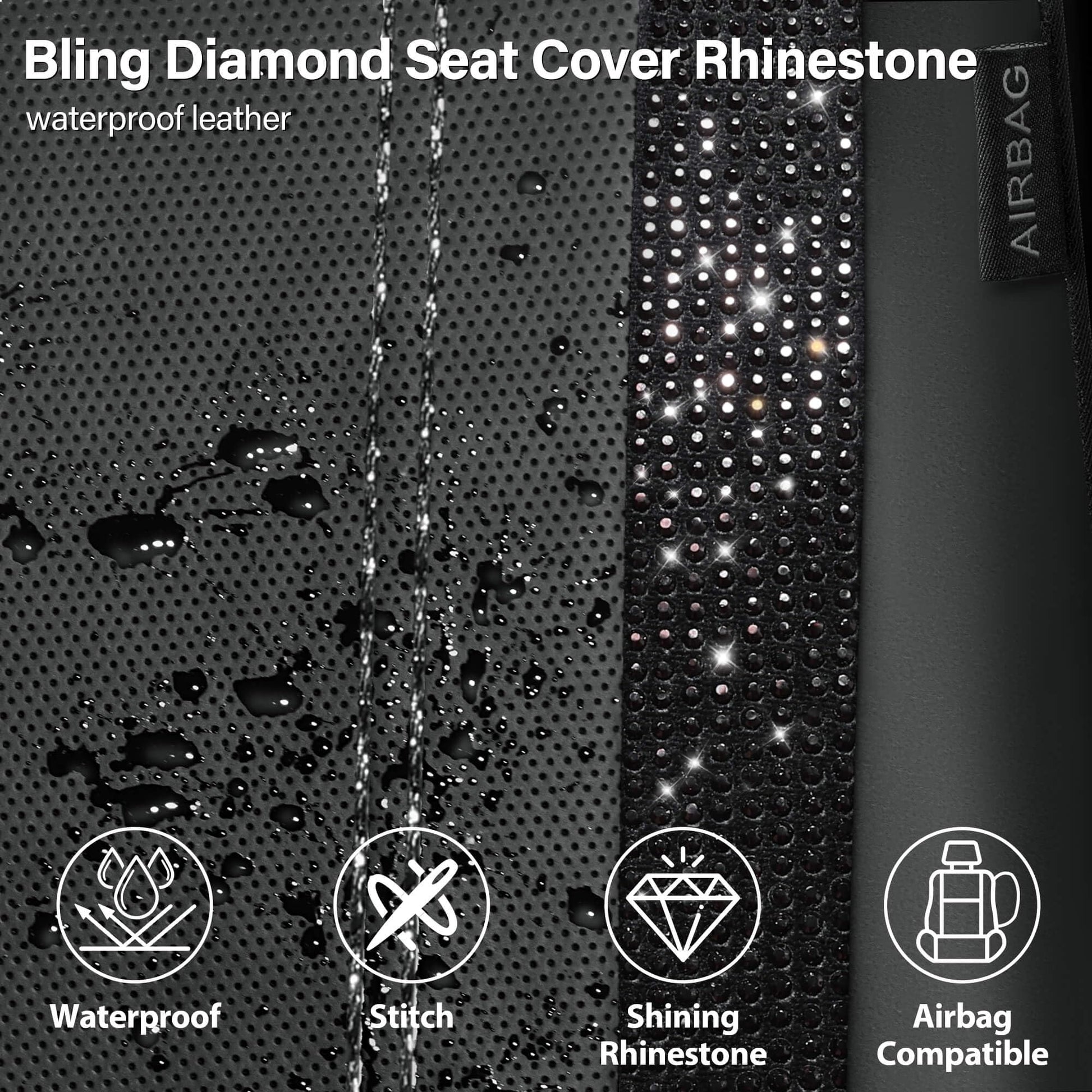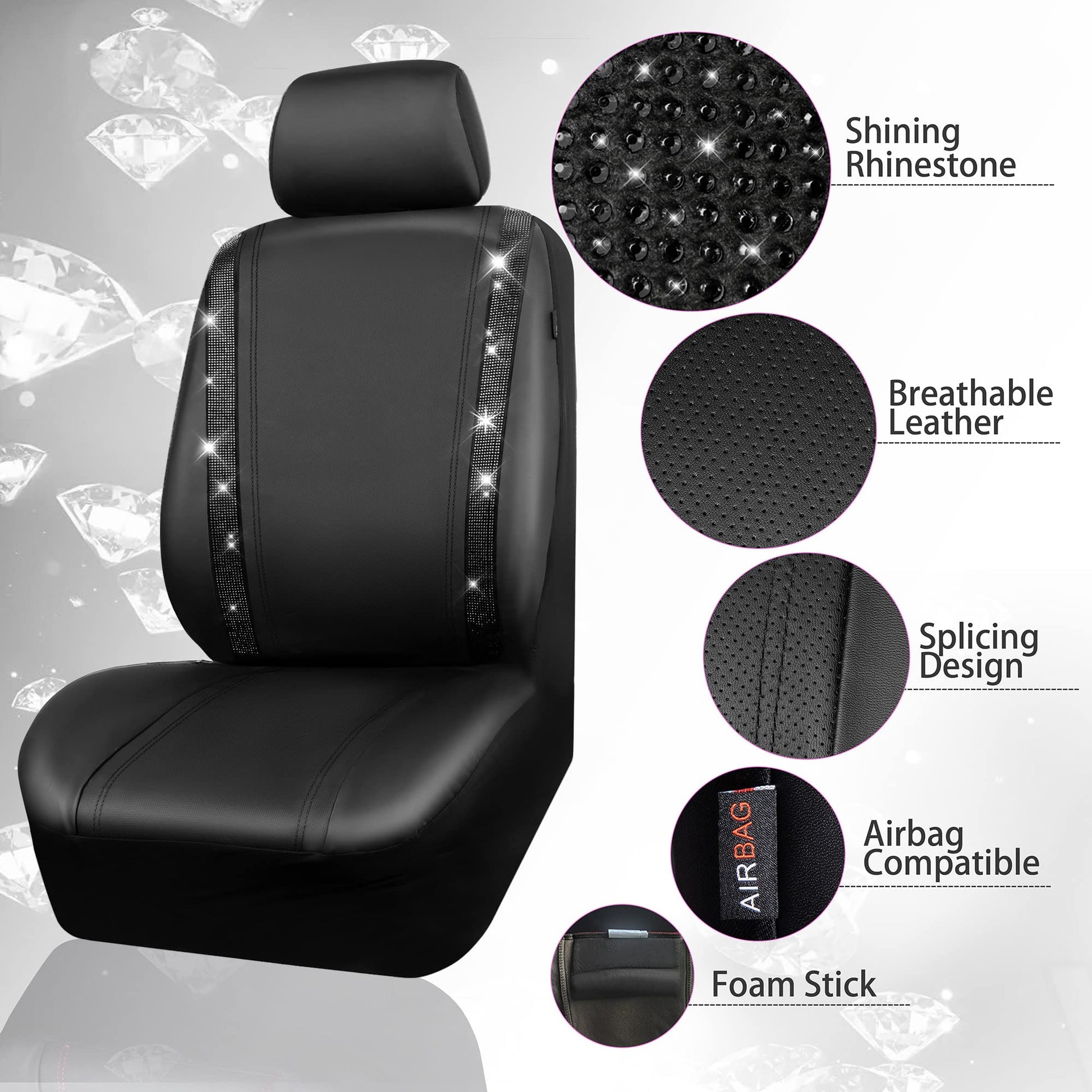 - BLING DIAMOND CAR SEAT COVERS: Premium PU Leather Durable Water resistant with pretty Bling bling rhinestones Made. Black leather with shiny rhinestones, sparkly bling diamond design perfect for women, girls. Perfectly match your interior look. Ensure your seat covers will last for many years to come. Refresh your interior look. Beautiful design with good quality.