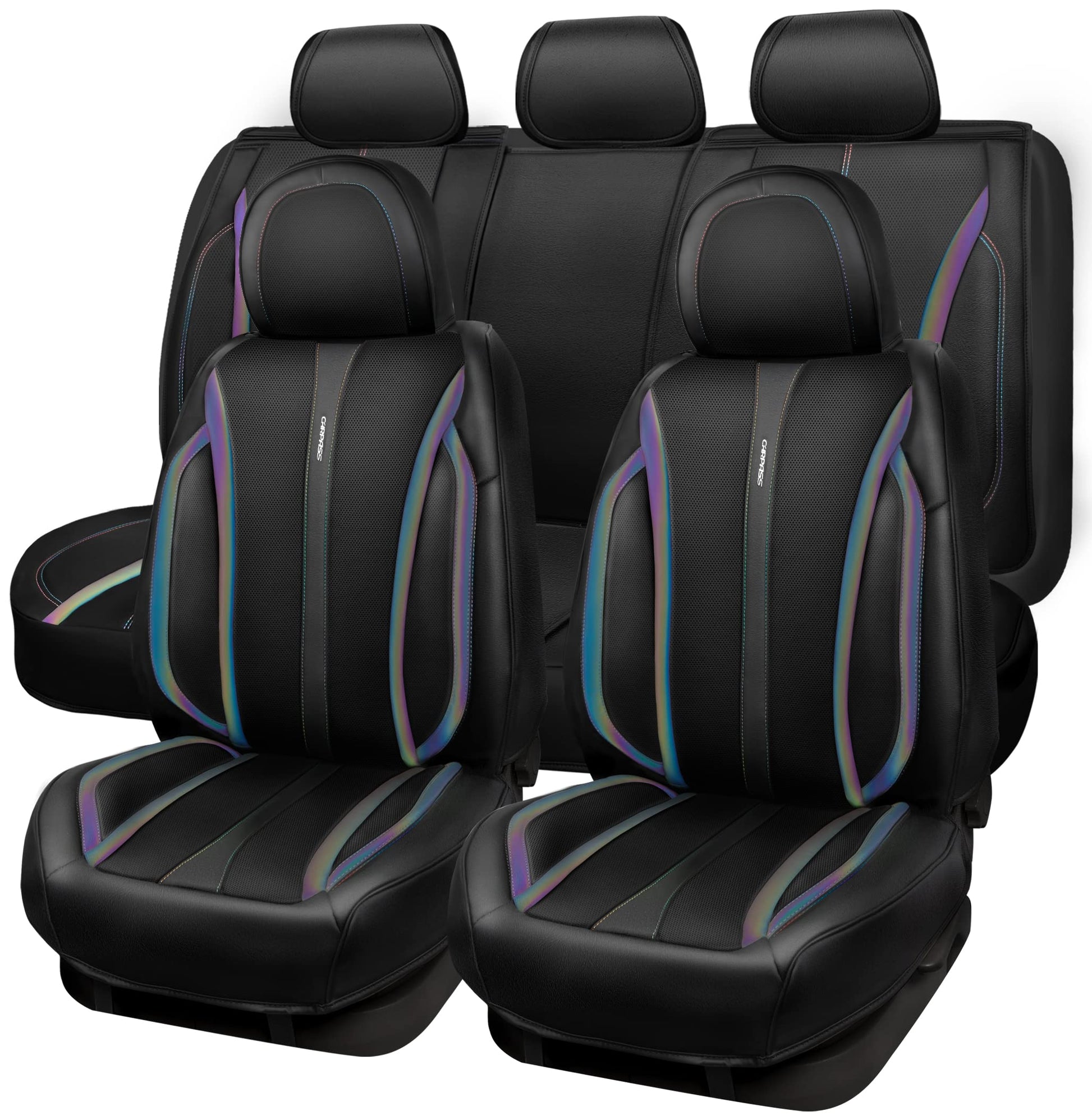 CAR Pass Nappa Leather Car Seat Covers, Durable Waterproof Luxury Universal for SUV Pick-up Truck Sedan, Anti-Slip Driver 5 Seats Covers Full Set with Backrest (Black Chameleon Iridescent Reflective)