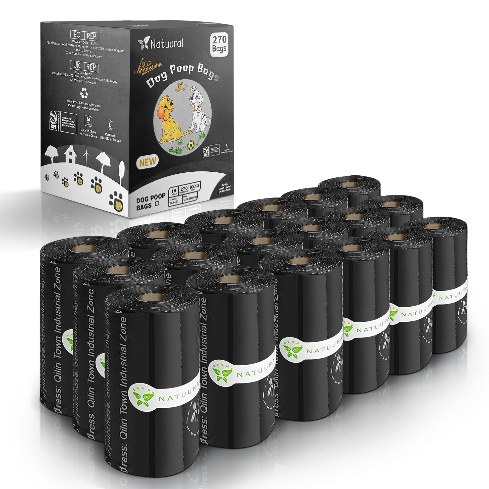 Certified Compostable Dog Poop Bags-270 Bags 18Rolls, Poop Bags for Dogs Made of Cornstarch - ASTM D6400 By USA, Leakproof Easy Open, Unscented Dog Waste Bags (Black)