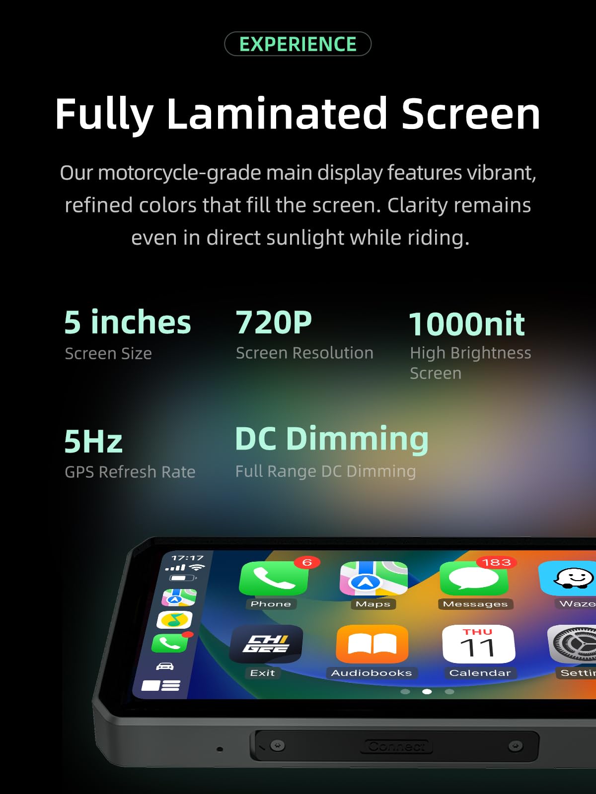 CHIGEE AIO-5Play Motorcycle Carplay Android Auto GPS Navigation System, 5" IPS LCD 60FPS, 5G Wi-Fi BT, IP68 Waterproof, Support Siri Google Assistant, Dedicated App