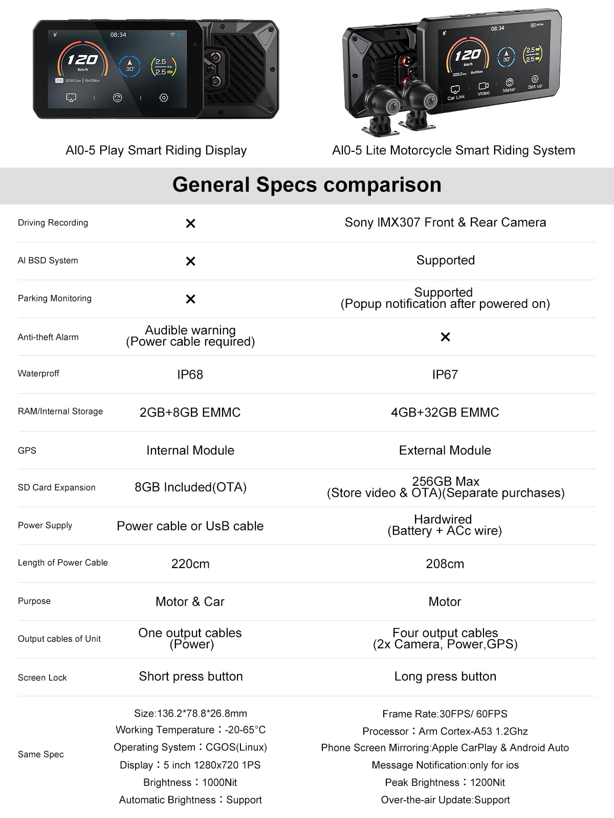 - Notes:This is the AIO-5 Play regular model, not the 5 Play for BMW model, please check before purchasing. The 5 Play for BMW model is expected to hit Amazon in MID September.【Tailored For Motorcycles Wireless CarPlay】CHIGEE AIO-5 Play is a light and luxurious version of the AIO-5 LITE, removing the front and rear lenses as well as the BSD function carried by the rear lens to meet more motorbike Carplay different from the needs of the 5lite, which can withstand extreme temperatures and impacts.