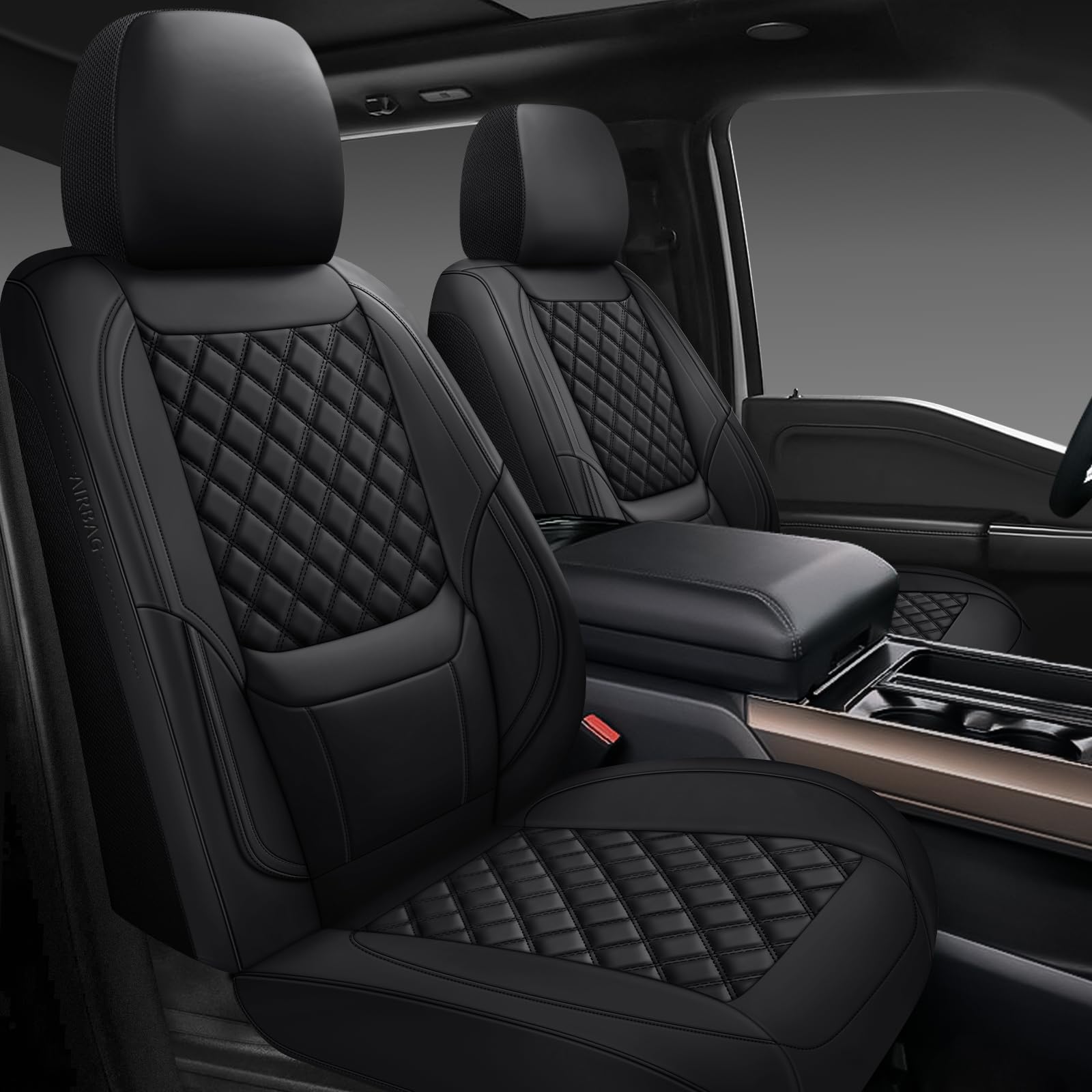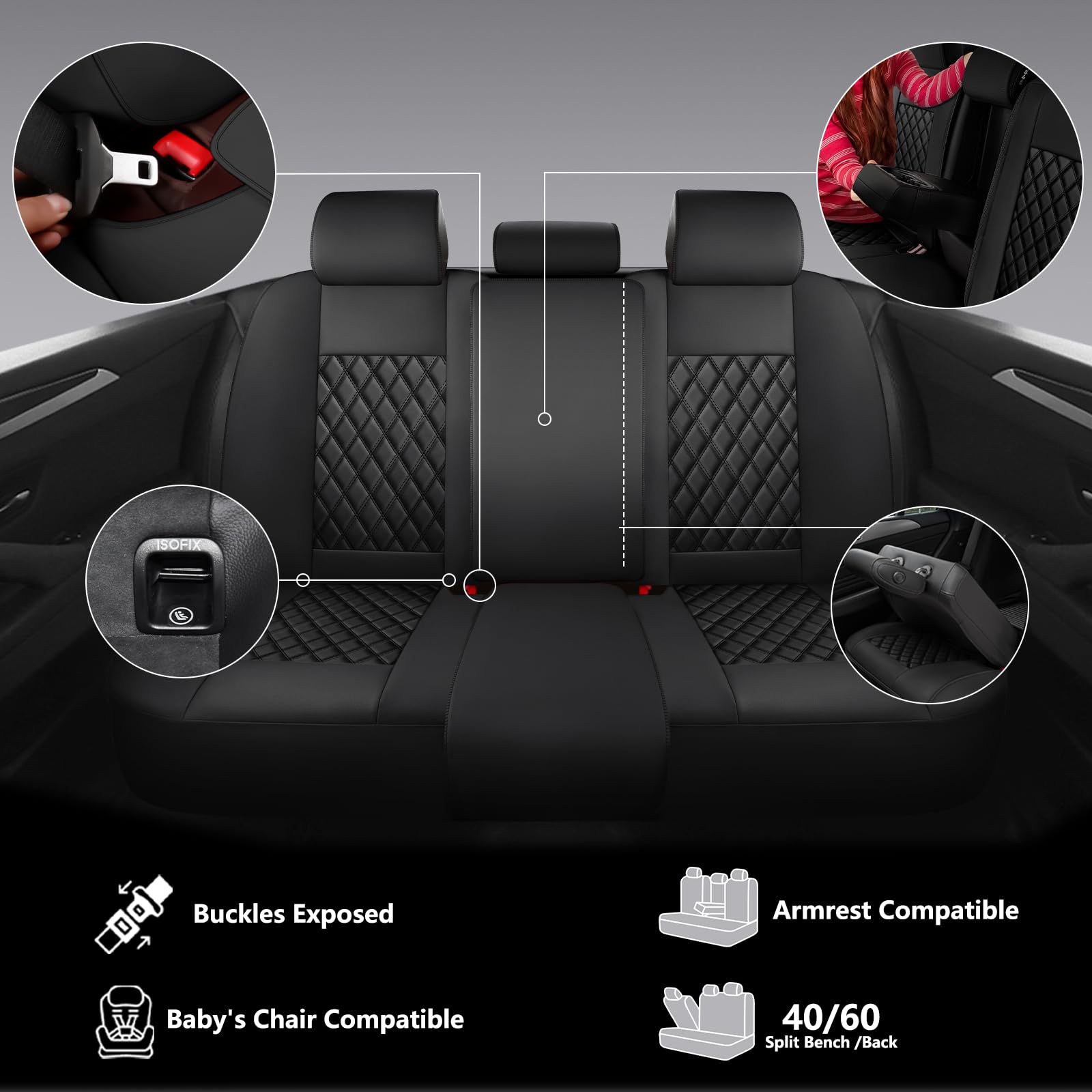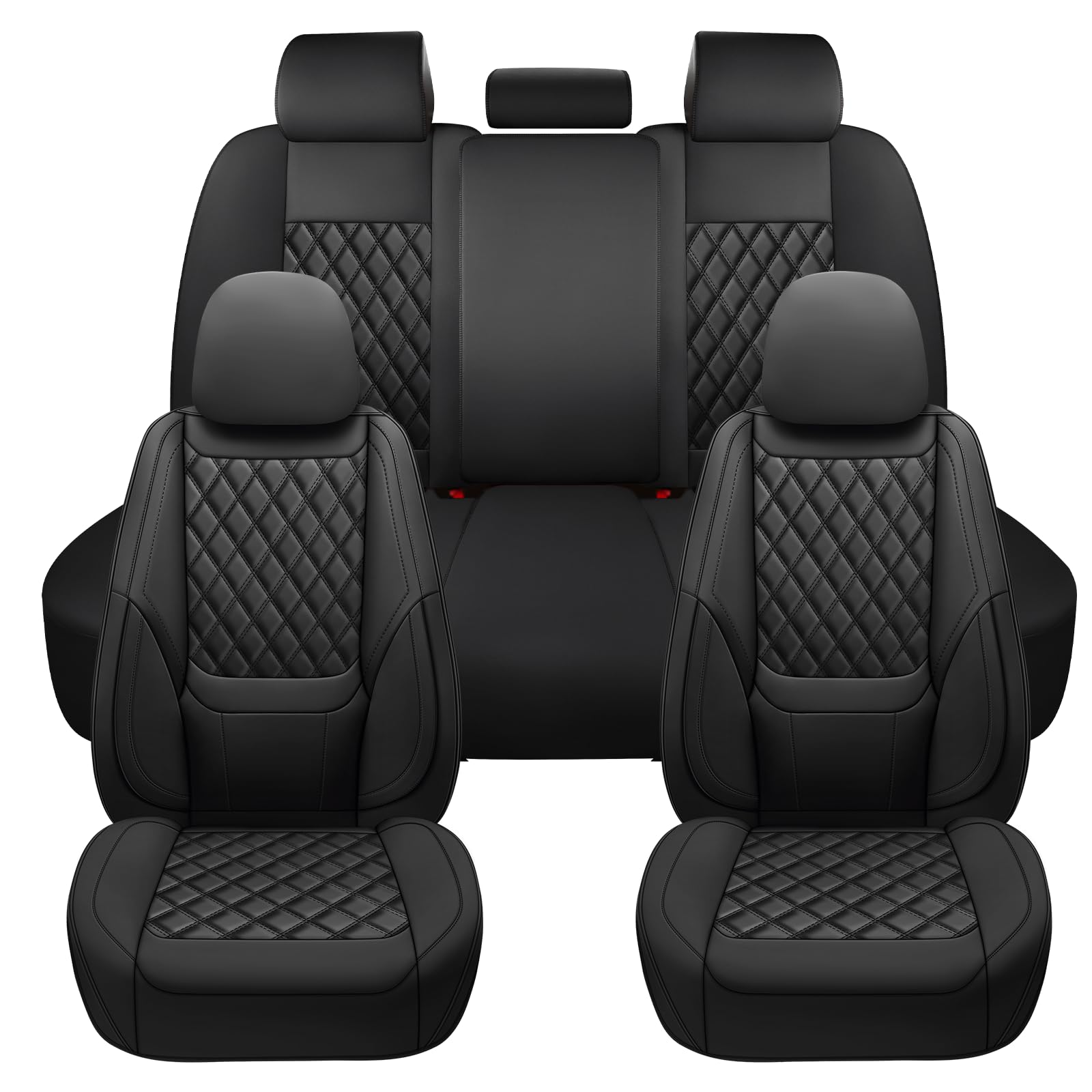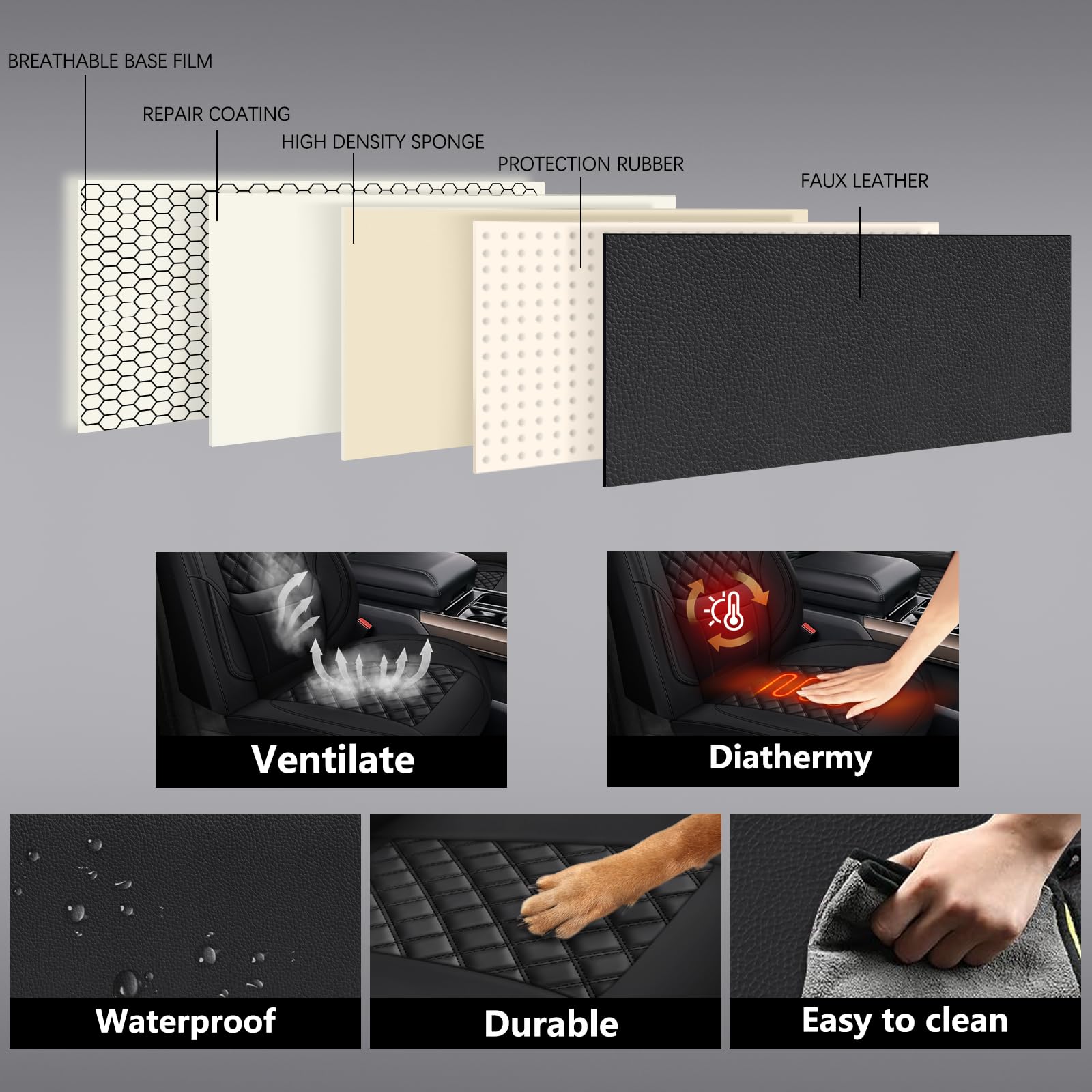 - 【360° Full Coverage Design】Our Black Seat Protector is designed to fully encase your seats (headrest to lower cushion), the leather seat covers protect against spills, pet claws, and UV damage. Precisely stitched seams ensure a factory-fit look for most sedans, SUVs, and trucks (compatible with Toyota,BMW,Ford,Chevrolet,Honda,Volkswagen,Nissan,Jeep,Lexus,Acura,Hyundai,Mazda,Mitsubishi,Subaru,Kia,Cadillac...).