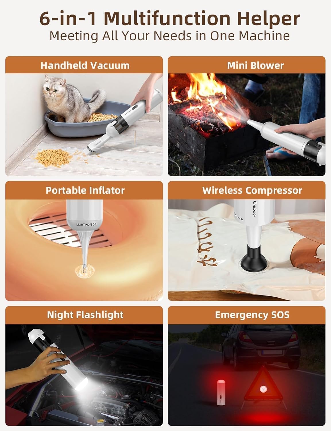 - 6-in-1 Multifunctional Design: This versatile handheld vacuum offers six practical functions in one compact device: vacuuming, blowing, inflating, air extraction, flashlight, and SOS light. Paired with a 2-in-1 cleaning brush, it effectively tackles pet hair, household crevices, car interiors, and other tight spaces.