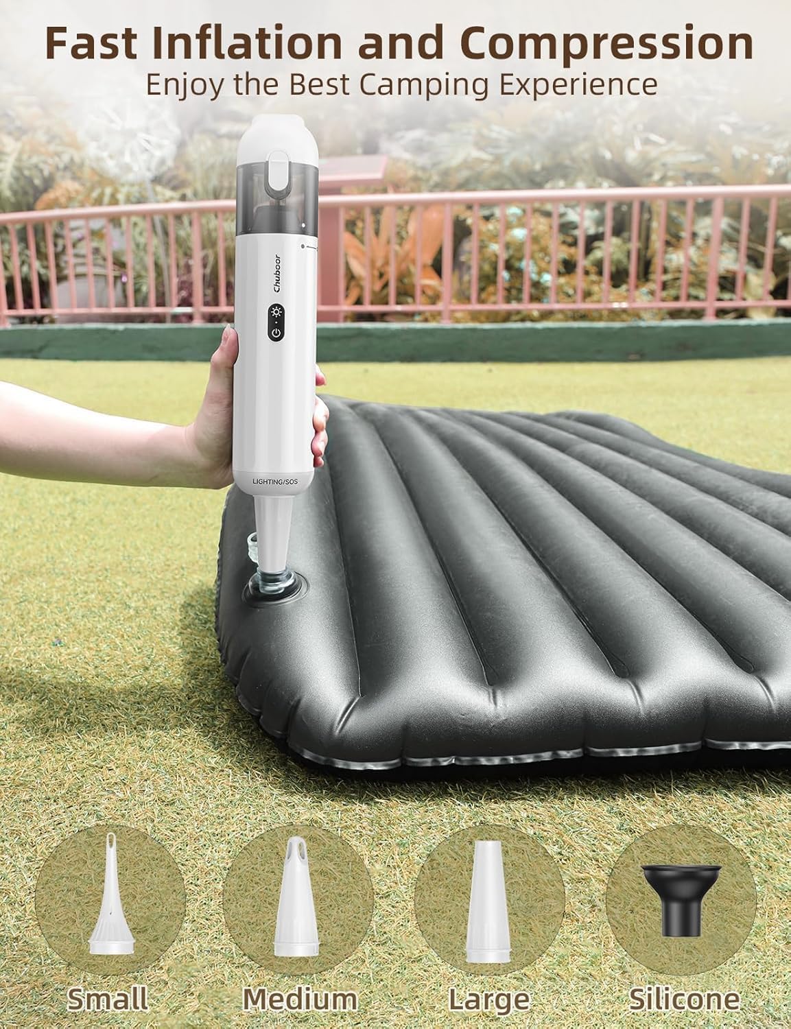 - Comprehensive Accessories for Multi-Purpose Use: The included 2-in-1 nozzle makes cleaning hard-to-reach areas, pet hair, and seat crevices a breeze. Additionally, three air nozzles are provided, allowing you to inflate items like air mattresses, pool floats, and sleeping pads with ease. The vacuum also features an air extraction function, perfect for vacuum-sealing storage bags, making it an excellent tool for both home and travel needs.