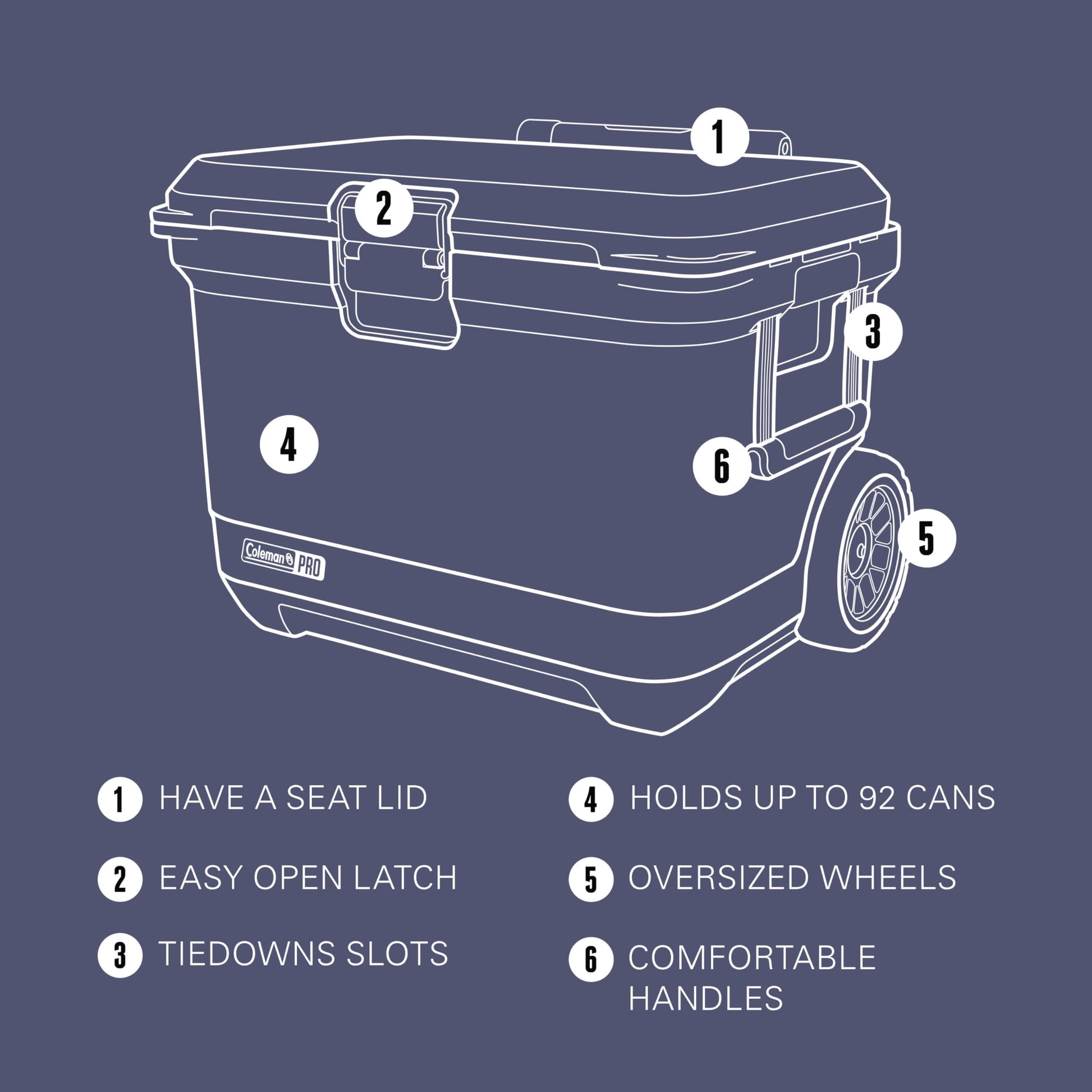 Details: You work hard for your time off. You deserve gear that goes above and beyond. Meet the Coleman Pro series, designed for those who expect more. This 55-quart hard cooler stays cold for up to 4 days thanks to a fully insulated lid and body featuring extra thick walls up to 2 inches wide. Use its rugged wheels and extendable handle to comfortably roll from backyard to beach to tailgate to sidelines, while the stainless steel latch allows you to open and close the cooler with one hand. Extra-wide drain plug is attached so you can drain fast without losing track of the plug. Tie-down straps and non-slip feet let you securely rig your cooler in the bed of your truck or in the D-rings of your raft, while a pad-lock opening lets you add extra security. The Have-A-Seat lid is built to accommodate an extra guest when you run out of seats around the campfire, at the game, or out back. Best of all, these built-to-last features are backed by our 10-year limited warranty, so you can confidently bank on Pro performance for all your trips to come.