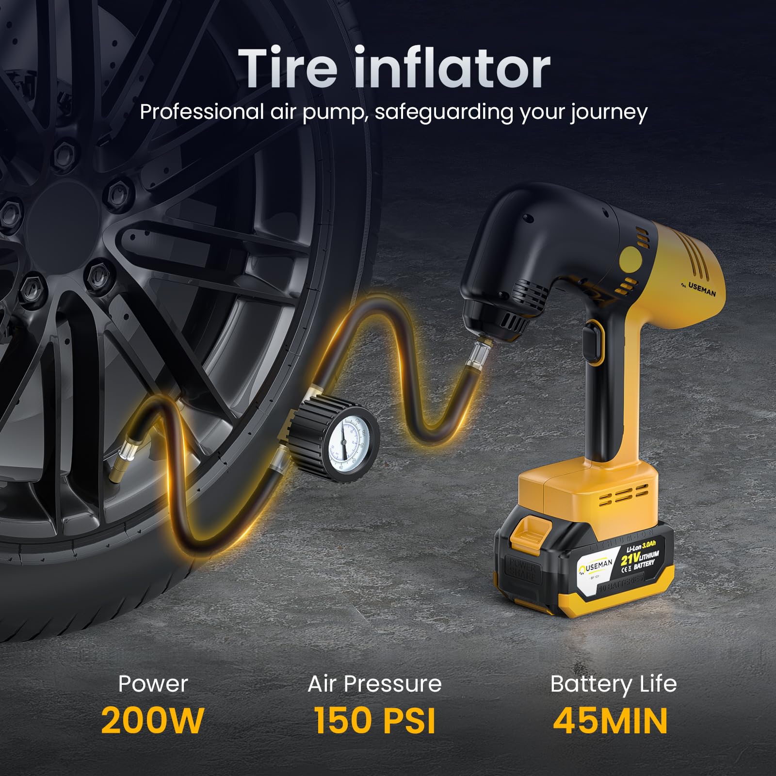 - Tire Inflator - Accurate Pressure for Road Safety,Delivers up to 150 PSI with 200W of power and 45 minutes runtime, featuring a clear pressure gauge to maintain optimal tire pressure for safer, more fuel-efficient driving.