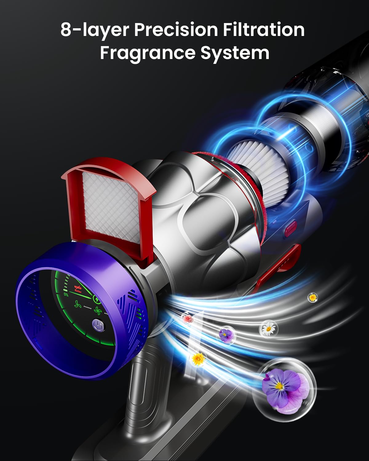 - 【Upgraded Filtration System - All You Get Clean and Fragrant】Equipped with a newly upgraded multi-cone filter and HEPA, it effectively separates clean air from dust, capturing 99.99% of the finest particles and absorbing airborne odors. The scented tablet on the air outlet creates a pleasant fragrance while the vacuum cleaner is in use. Perfect for families with pets.