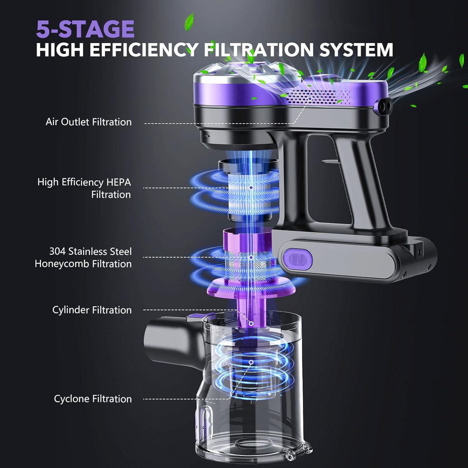 - EFFICIENT FILTRATION SYSTEM: This cordless vacuum cleaner is equipped with a 5-stage advanced filtration system, which can efficiently absorb 99.99% of dust particles to ensure cleaner air at home. The large-capacity dust cup meets a variety of cleaning needs, and the one-button emptying dust cup design avoids contact with dust and makes cleaning more hygienic.