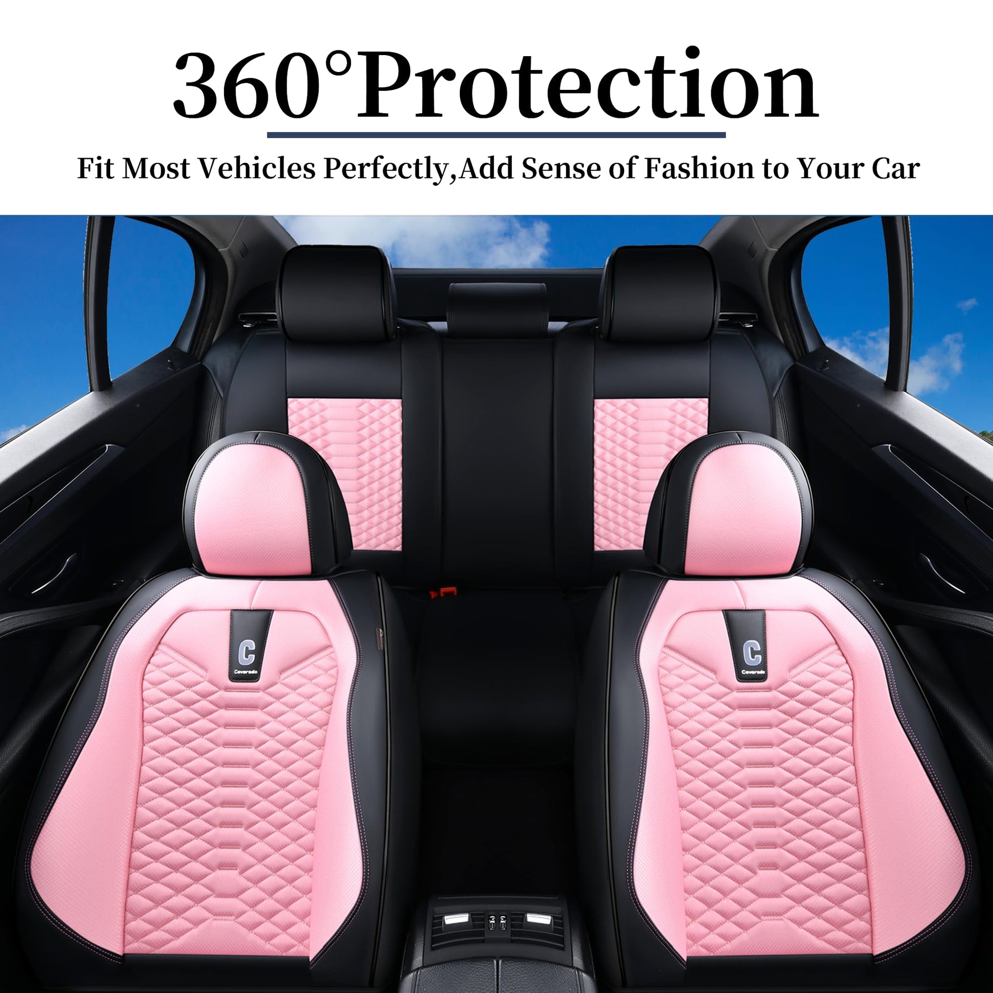Coverado Car Seat Covers Full Set, 5 Seats Universal Seat Covers for Cars, Breathable Fabric& Faux Leather Auto Seat Cushions, Front and Rear Seat Protectors Fit for Most Sedans SUV Truck, Pink