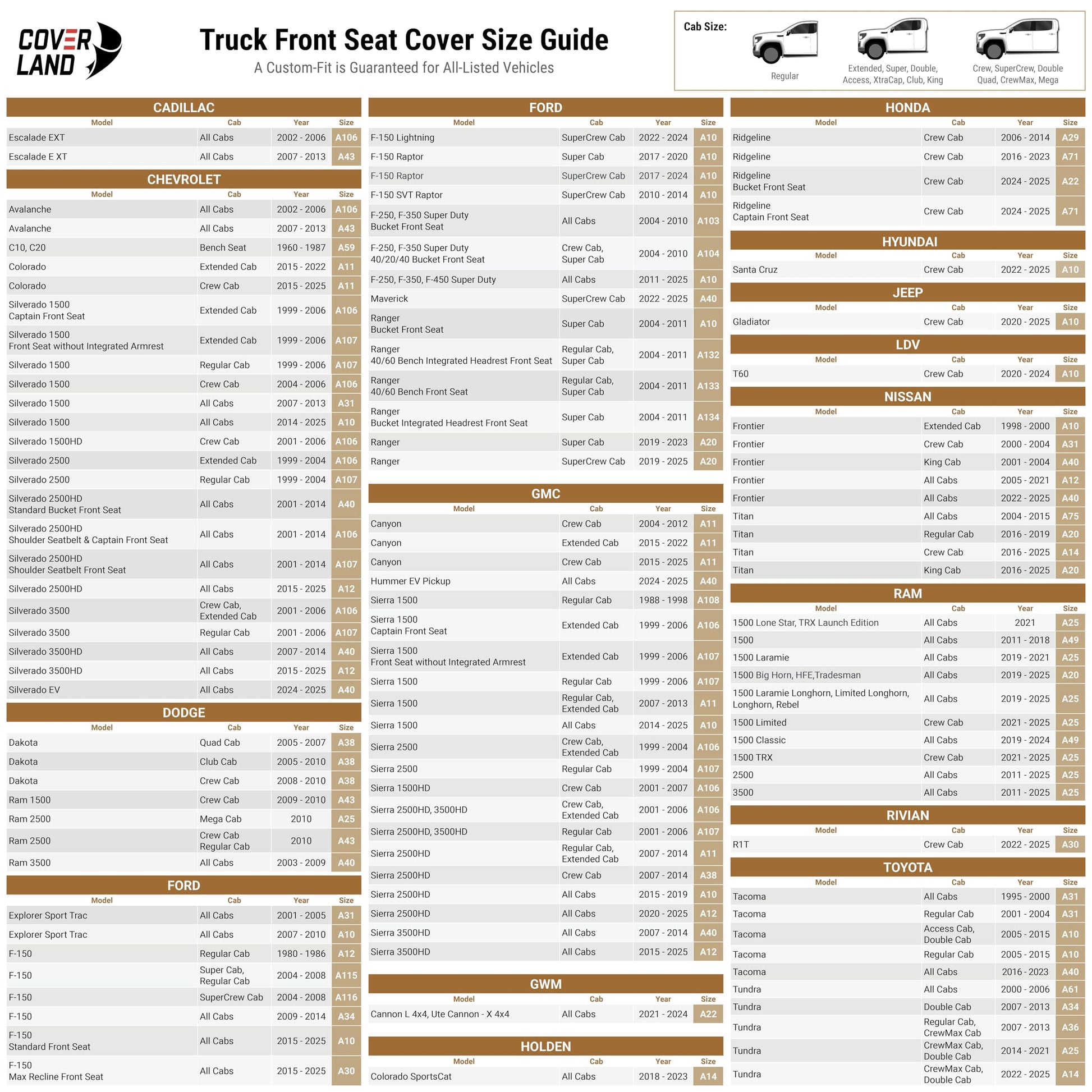 - CUSTOM FIT & ULTIMATE PROTECTION: Protect your 2014-25 Silverado 1500, 2007-10 Explorer Sport Trac, 2015-25 F150 All Cabs Standard Front Seat, 2022-24 F150 Lightning, 2017-24 F150 Rap-tor, 2010-14 F150 SVT Rap-tor, 2011-25 F250 F350 F450 Super Duty, 2004-11 Ran-ger Bucket Front Seat, 2014-25 Sierra 1500, 2015-19 Sierra 2500HD, 2022-25 Santa Cruz, 2020-25 Gladiator, 1998-00 Frontier, 2005-15 Tacoma Standard Front Seat, 2005-15 Tacoma Bucket Front Seat with our custom-fit seat covers.