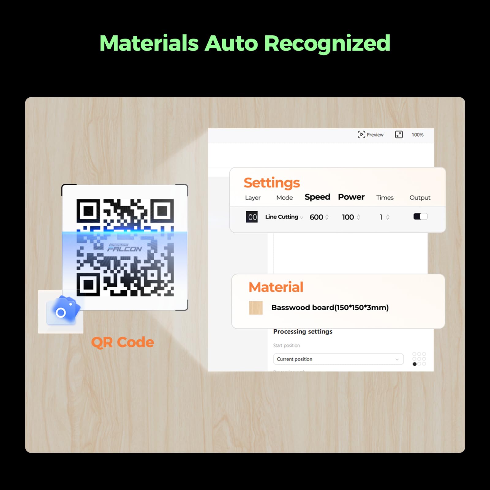 - Accurate Positioning & Material Detection: The Falcon A1 features a high-definition panoramic camera that allows for real-time previews, precise contour extraction, and batch fill positioning. Built-in material presets simplify the process, making it easy and stress-free. Just connect to your computer to perfectly align your design, minimize material waste, and boost efficiency—ideal for handling complex or multi-piece projects.