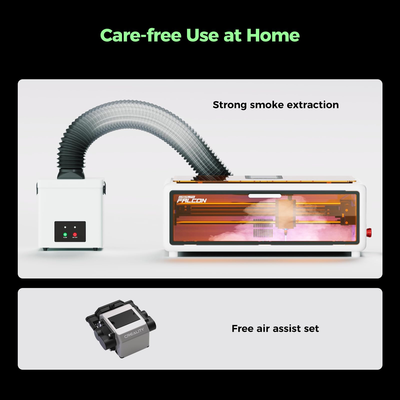 - Certified Class 1 Safety for Home & Studio: A fully enclosed design blocks 99% of harmful laser light, keeping your eyes protected without goggles. Smoke and noise are minimized, thanks to an integrated fan system. With a lid-open auto stop and emergency stop button, Falcon A1 ensures a secure and clean workspace for every user