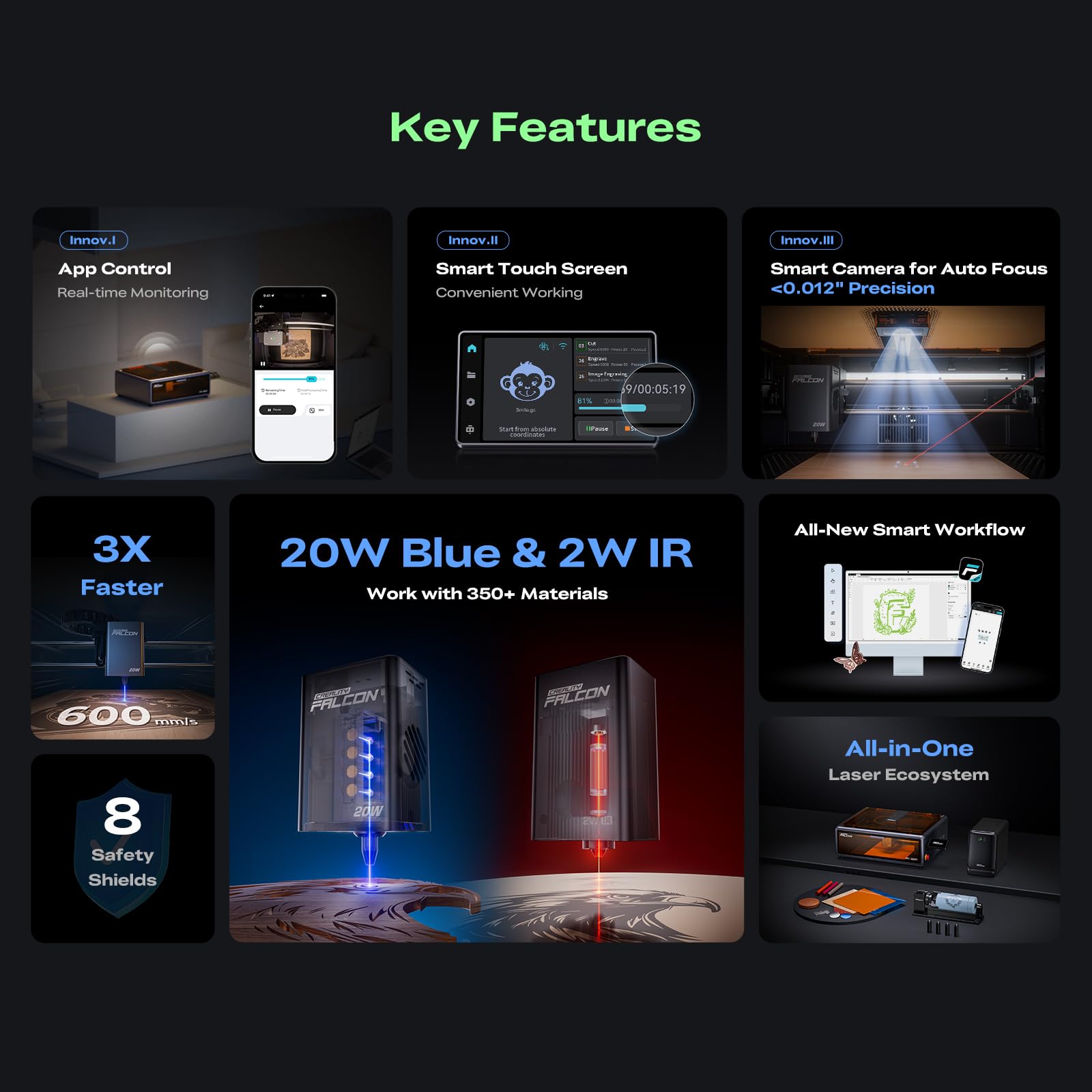 - 20W Blue & 2W Red Light Switching- The Falcon A1 Pro 20W blue-laser engraver empowers you to create with professional precision—capable of cutting through 10 mm basswood and 8 mm black acrylic at speeds reaching 600 mm/s. For unparalleled fine work, the optional purchased 2W infrared (IR) module harnesses 1064 nm technology and a 0.03 mm ultra-fine laser spot, delivering extraordinary clarity for engraving photographs, jewelry, business cards, and more