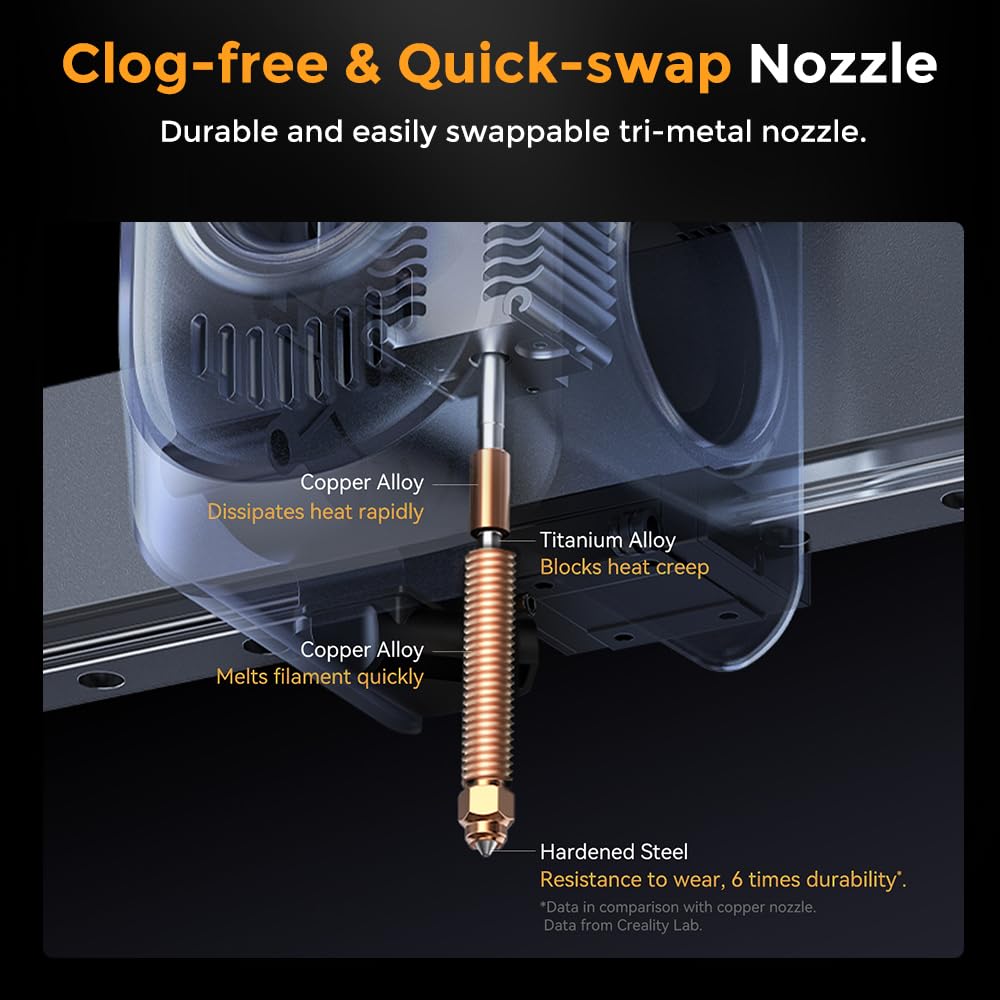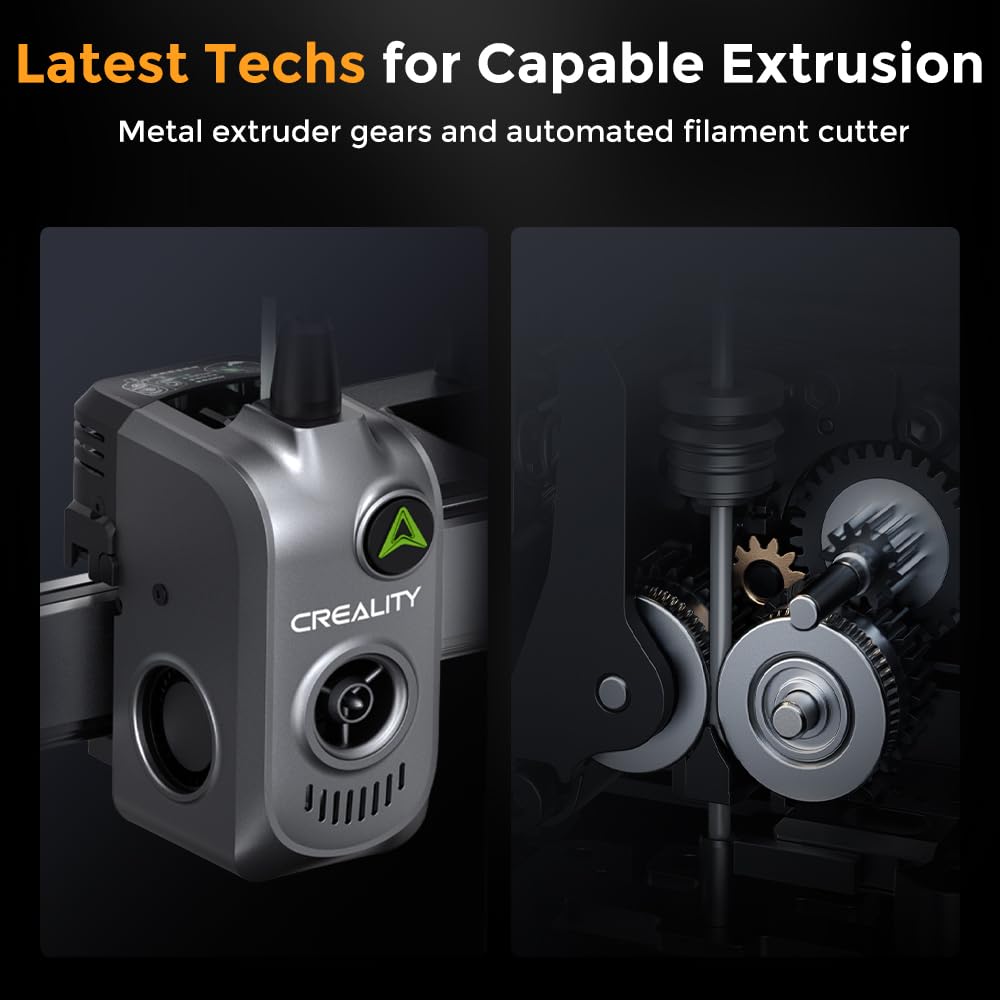 - Upgraded Durable Direct Drive Extrusion: All-metal extruder gears are wear-resistant and long-lasting. Durable filament cutter can be magnetically pulled back into position after cutting. An integrated nozzle that is clog-free and allows quick swap. Also a built-in filament run-out sensor in the extruder, the usage of filament is now monitored more closely and precisely for run-out or breakage. Filaments can be unloaded or switched (with CFS) with less residual waste