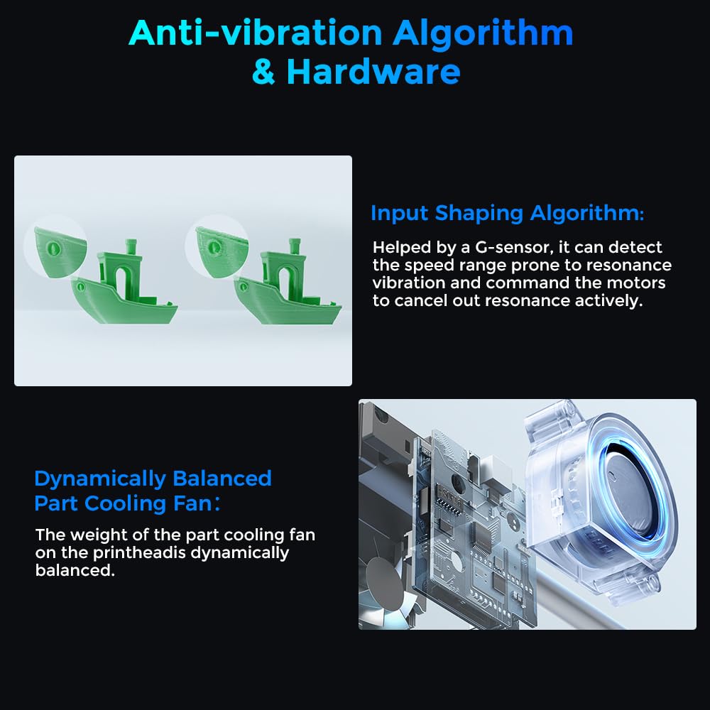 - Other Details and Software: A dynamically balanced part cooling fan produces fewer vibrations, which are mitigated by active input shaping. PEI flexible build plate is two-sided epoxy flexible build plate, no more ringing, and surface artifacts. heat and wear resistant, bendable for easy print removal. Its slicing software, Creality Print 5.0, has an all-new UI for a refreshing slicing experience. It supports more than 40 kinds of filament presets, 3MF model format, and efficient multi-plate management